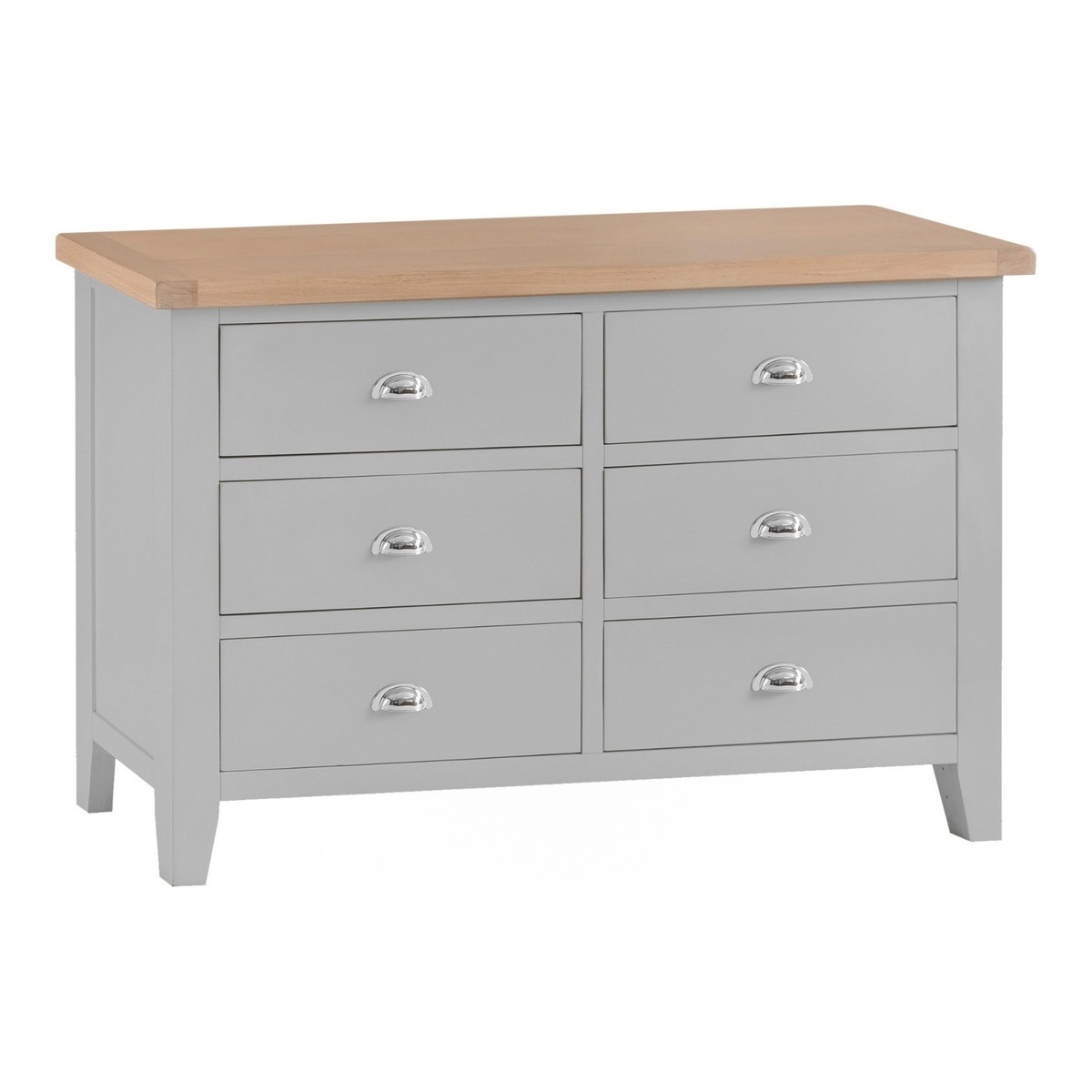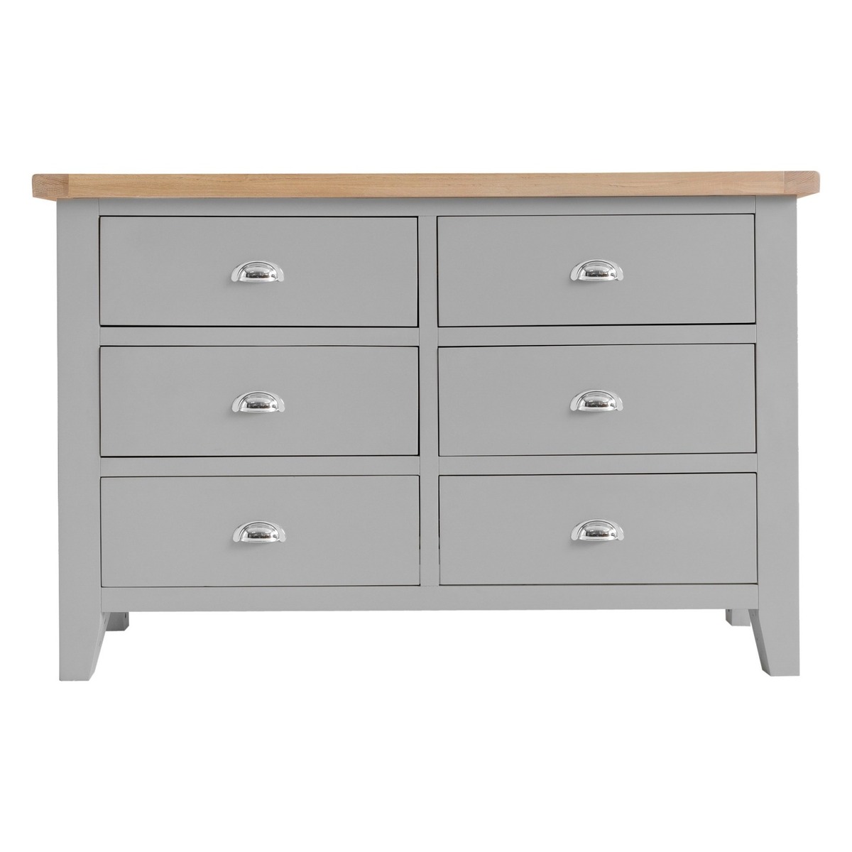 The Willow Oak and Grey 6 Drawer Chest of Drawers blends classic modern style for a piece of bedroom storage furniture that complements any home. Featuring a stylish two-toned design, the large chest of drawers is complete with a lime washed oak top contrasting with a grey painted frame. Stylish large 6 drawer chest. Attractive blend of modern and classic style influences complements any bedroom. Two-toned finish with lime washed oak top and millstone grey painted frame. Drawers on metal guides. Chrome cup handles complete the look. Complements other items in the Willow Oak and Grey Bedroom Collection.