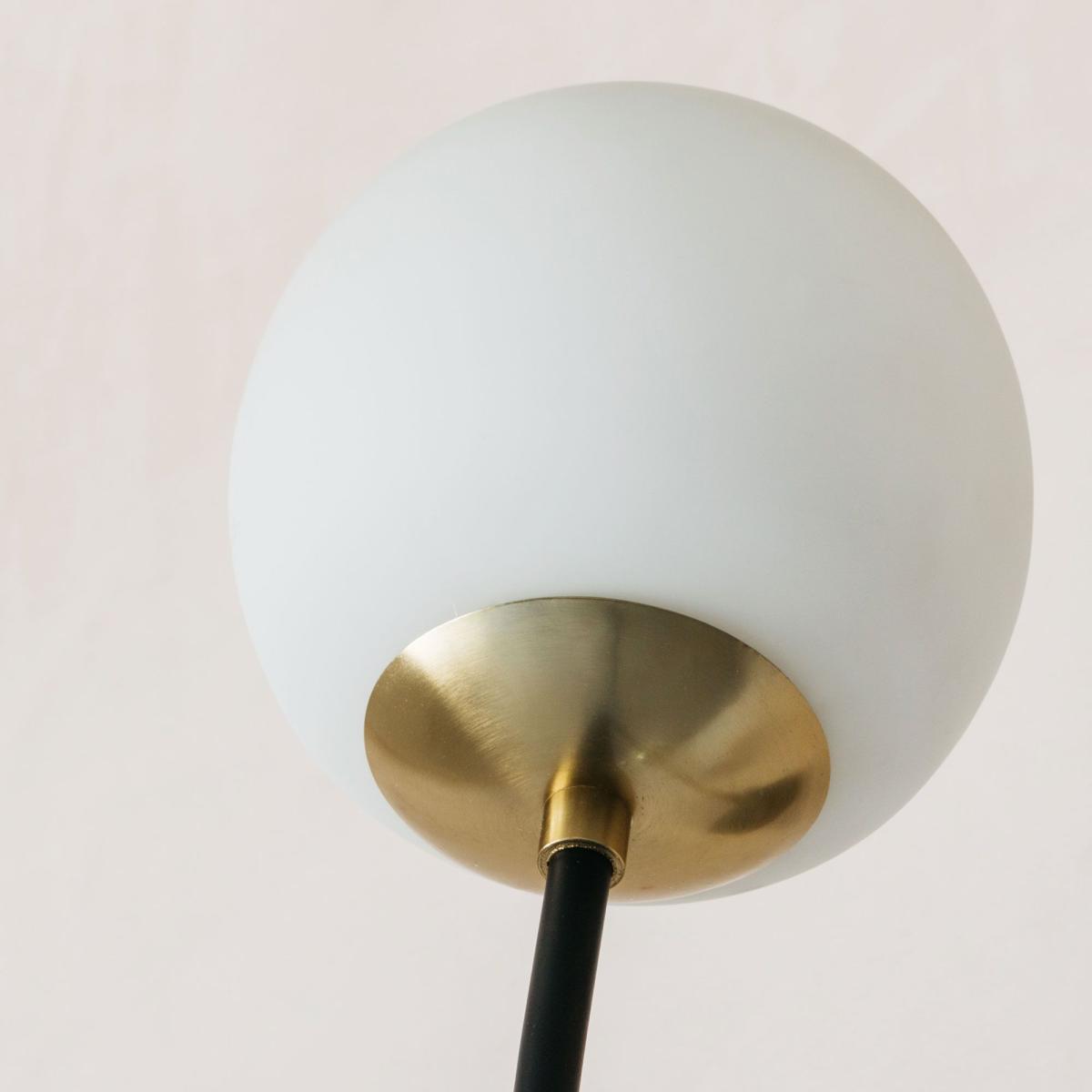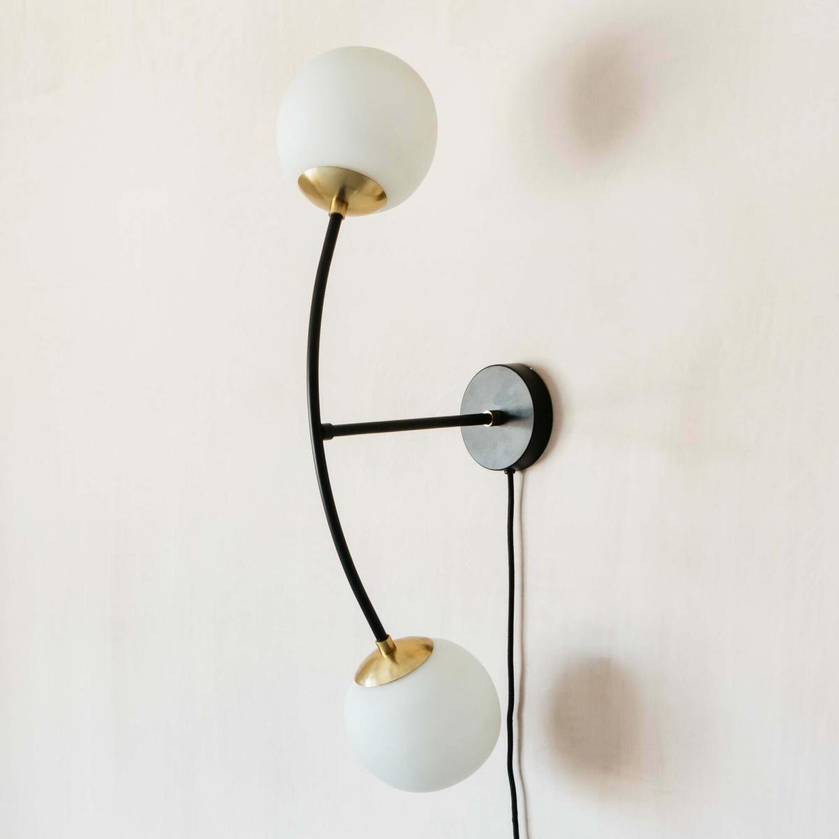 Two opaque globes balance on a fine black bow with gold detailing to create a softly diffusing wall light perfect for any Art Deco-inspired interior.