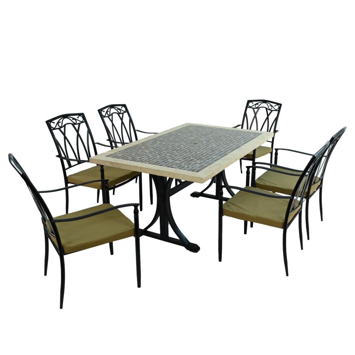 Featuring a classic mosaic design, this Wilmington dining table set will be a great addition to your garden. The Wilmington dining table has a heavy stone table top that has a mosaic design which has been hand laid. The Ascot chairs have been crafted from steel with an elegant backrest design. Full assembly of the set is required.