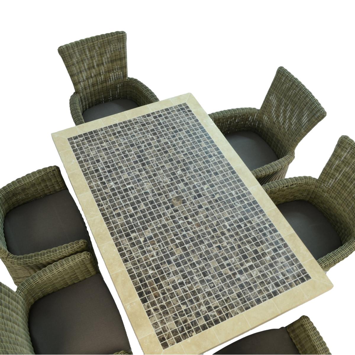 With a classic mosaic designed table, the Wilmington has a stunning, contemporary look. The Wilmington dining table has a heavy stone table top that has a mosaic design which has been hand laid. The Dorchester chairs have been made using a weather resistant wicker. Full assembly of the set is required.