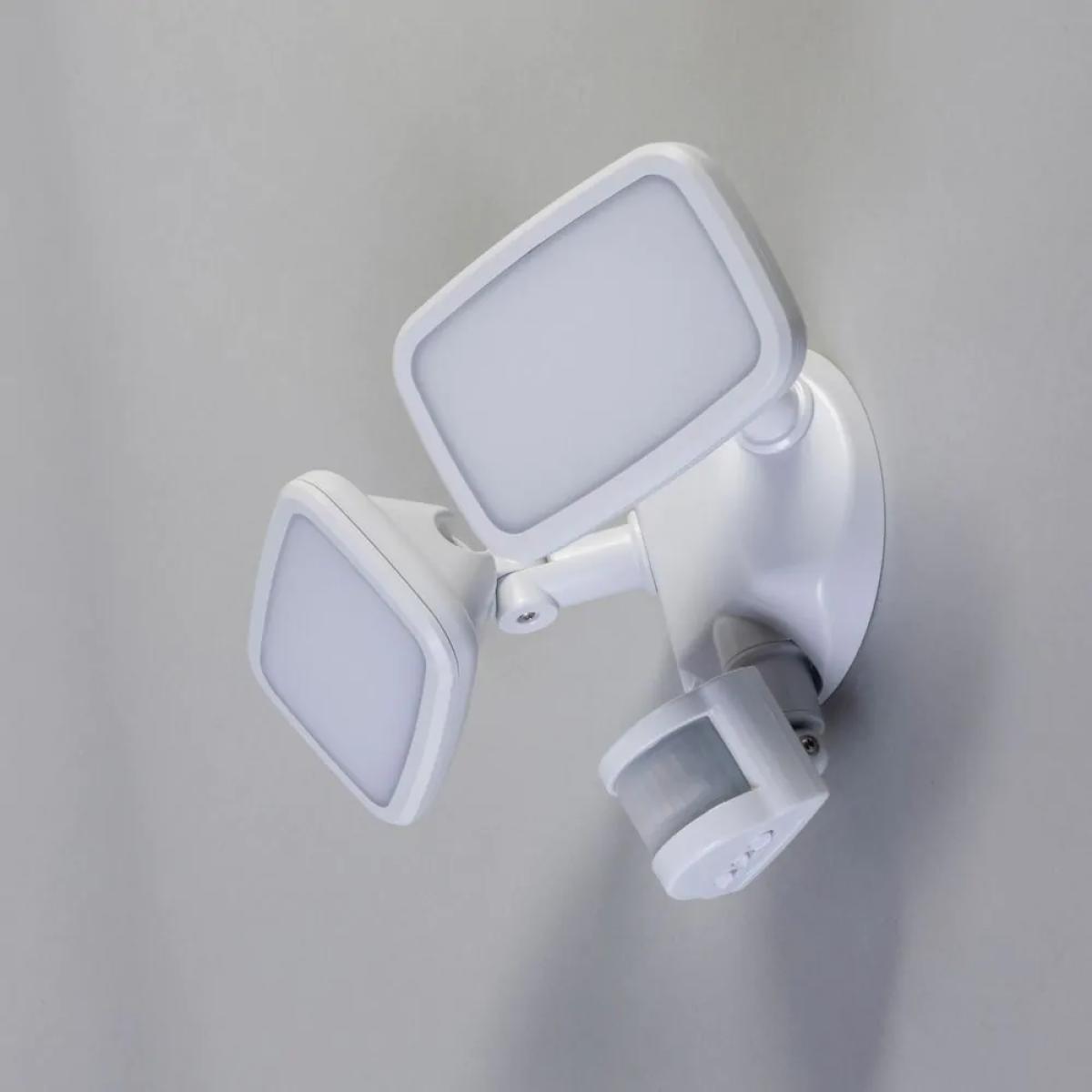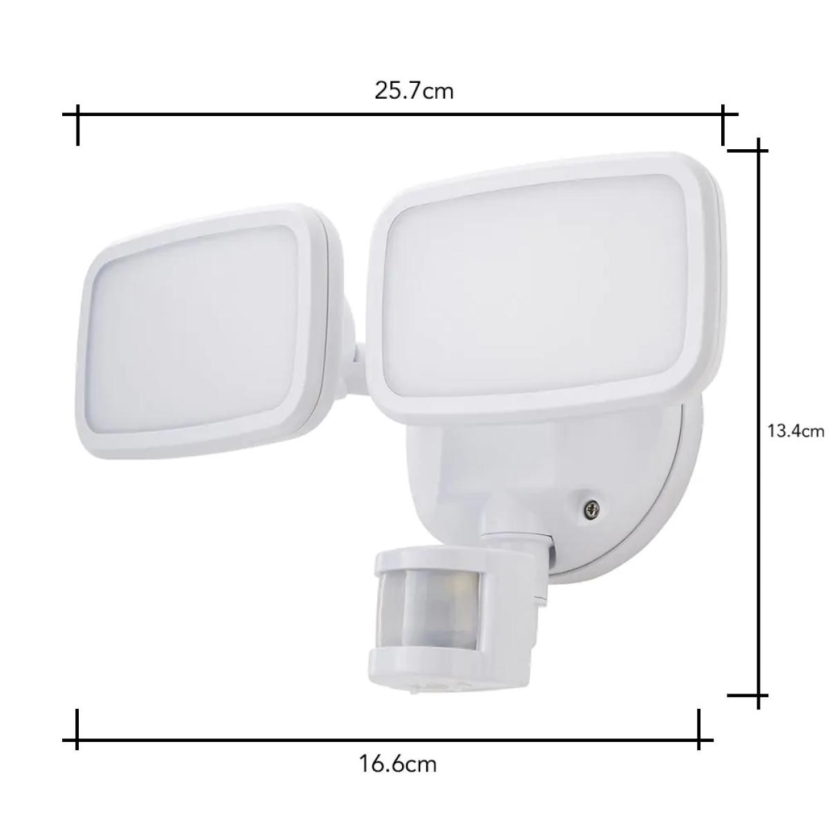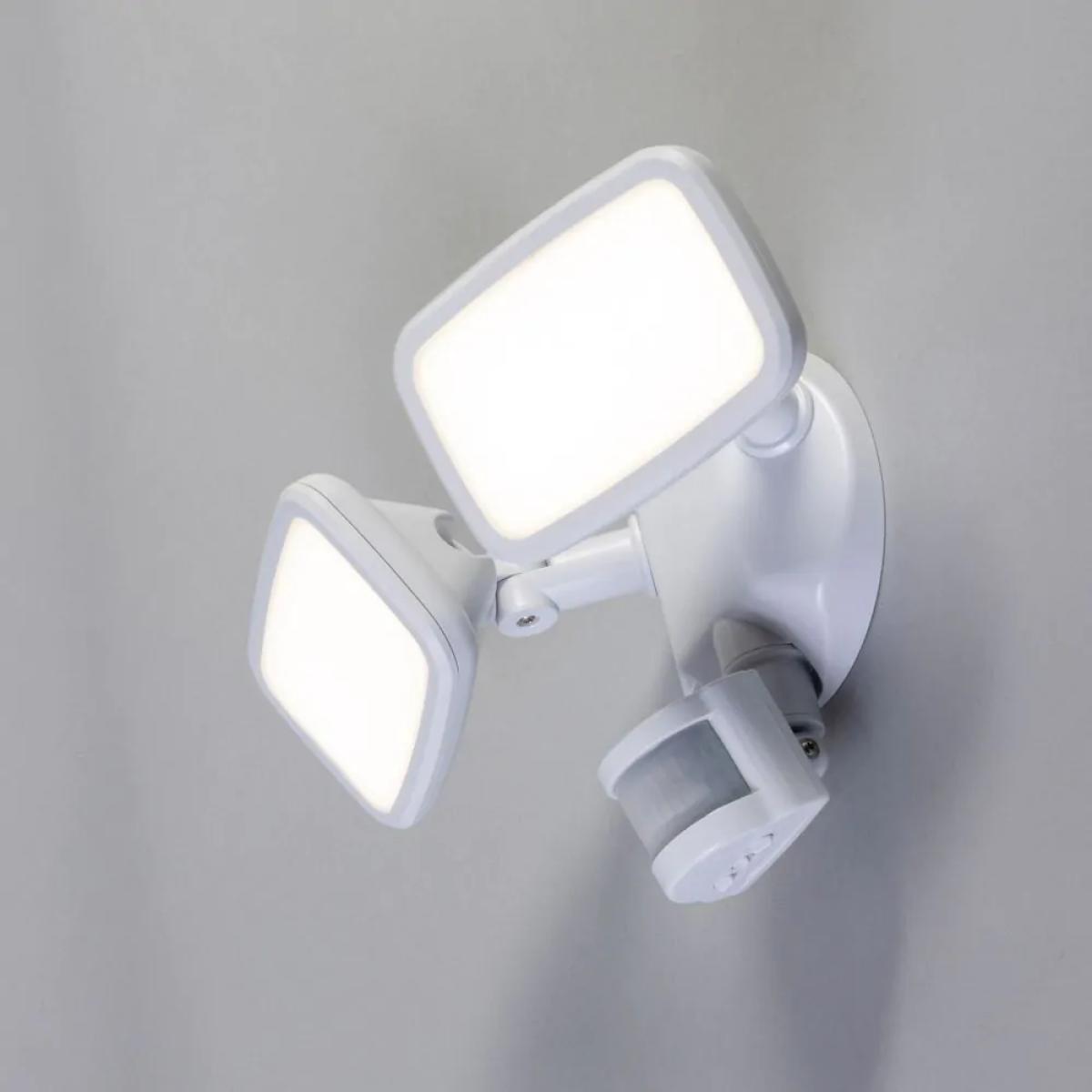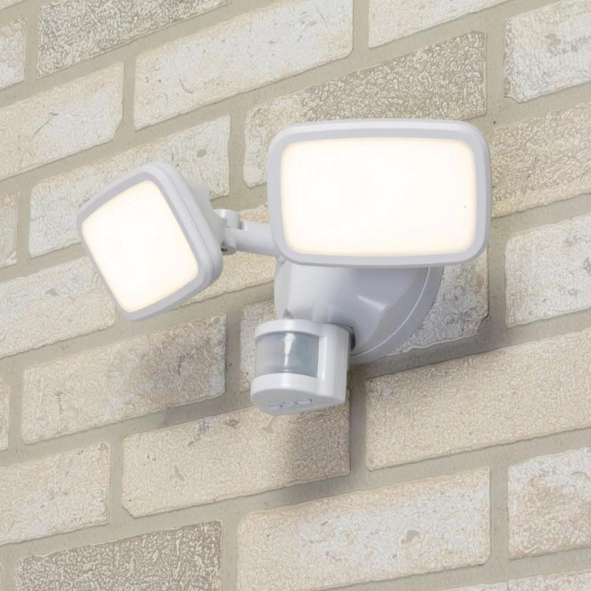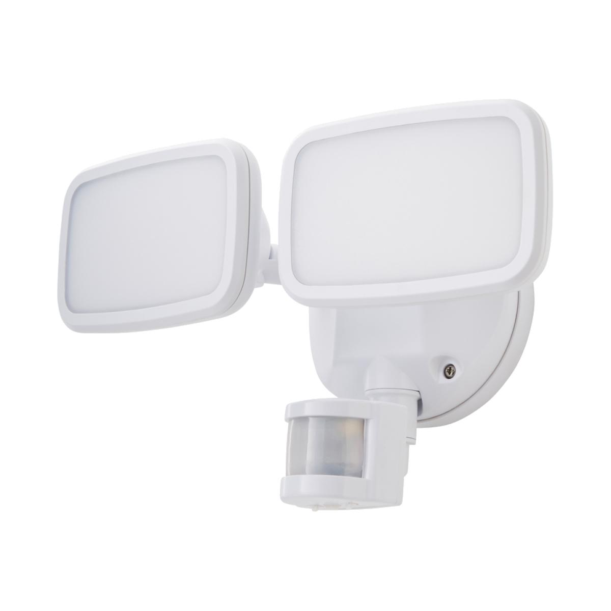 Get a matching lighting look for your outdoor spaces with the Wilson Twin 20 Watt LED Outdoor Flood Light, finished in white to blend seamlessly with white walls and doors. This wall light is IP65 rated for water resistance and is LED integrated, meaning you do not need to purchase bulbs for this light. It also comes with a PIR motion sensor, which detects movement outside your home using infrared technology, triggering the light to turn on automatically, and features 2 adjustable flood light heads, allowing for a greater visibility of your outdoor spaces.