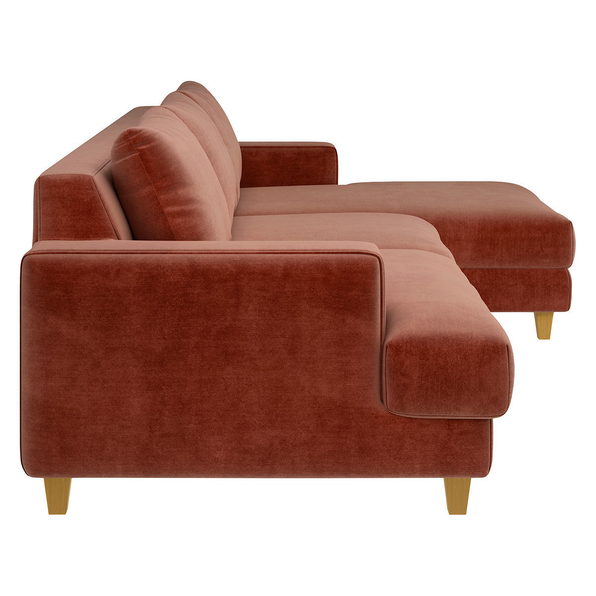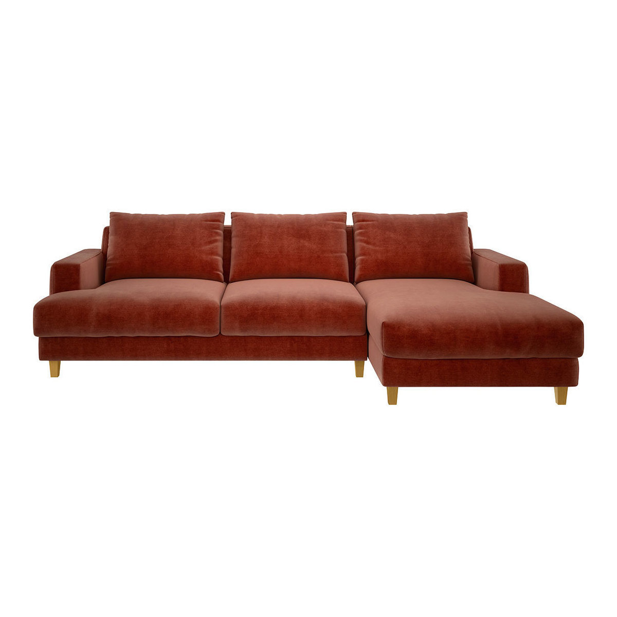 The Wiltons orange velvet 4 seater right-arm chaise sofa has a contemporary style that’s great for modern homes. With clean lines, generous proportions and soft, pillowy back cushions, it doesn’t compromise on comfort. Made in Italy, the sumptuous sofa has an extra-deep seat with classic T-shaped, feather-topped foam cushions, feather-and-fibre back cushions, padded box arms and oak-stained legs. Exclusive to Habitat, Wiltons is made to order and available in a variety of configurations, making it even easier to create the perfect sized sofa. The sofa is available in 4 fabrics and a wide choice of colours and the covers are easily removable for cleaning.