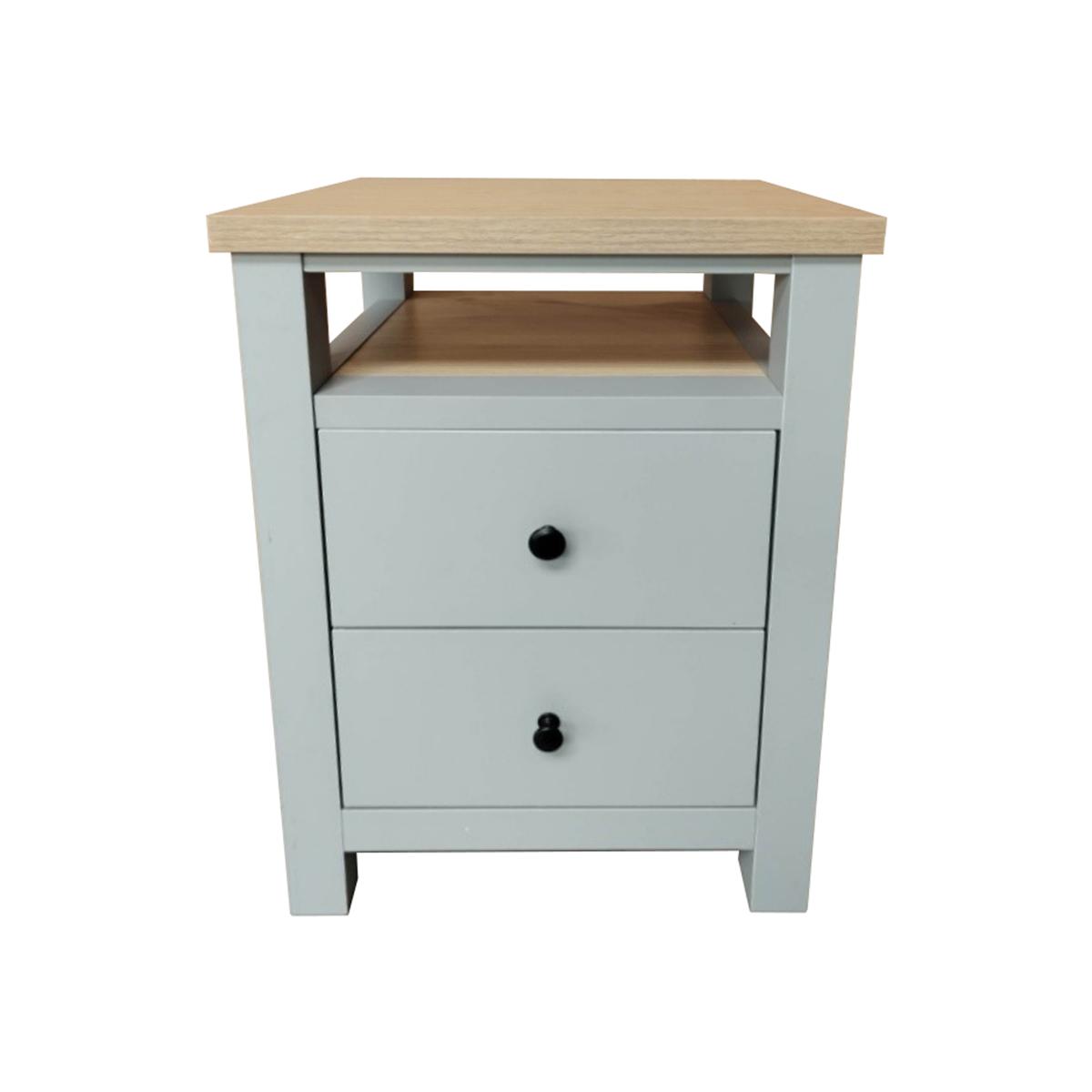 The Wiltshire 2 drawer bedside table is a versatile and functional piece of bedroom furniture. This bedside table grey model features a sleek appearance, with the body constructed from durable MDF melamine. The top surface of the bedside table cabinet is finished in a contrasting wood colour. The Wiltshire bedside table with drawers provides ample storage space for personal items. In addition, this bedside cabinet serves as a practical side table for bed setups. Its grey colour seamlessly integrates with a variety of bedroom decors, while the wood-coloured top adds a warm, vintage appeal. Whether you're looking for a grey bedside table to compliment your bedroom's theme or a 2 drawer bedside table to maximise your storage options, this item is a perfect choice.