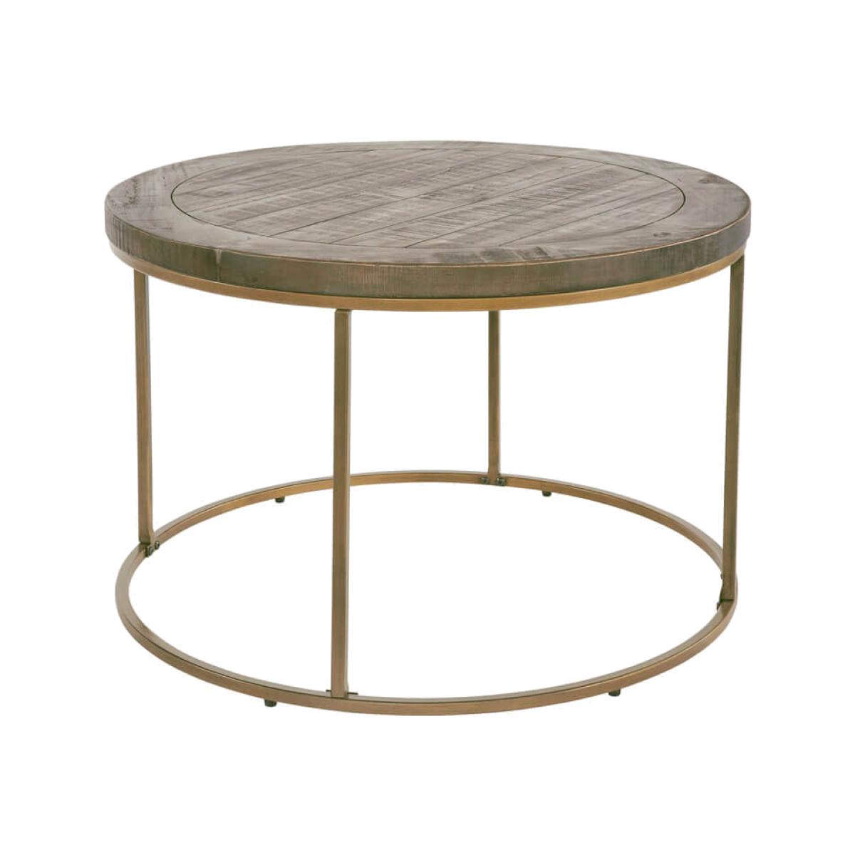 Key features:. With leanings into opulent art deco styles this round reclaimed wood coffee table is as much a shabby chic piece for the living room, an intriguing cross of two worlds, and it simply works. Reclaimed treated timber makes up the table top, with rich shades of nutmeg, it will serve as a perfect surface for many household items, a colour of wood capable of hiding small marks from day to day use. Whilst the airy sleek circular frame is elegantly constructed from bronzed brushed steel consolidating the lovely appeal of this reclaimed wood coffee table.