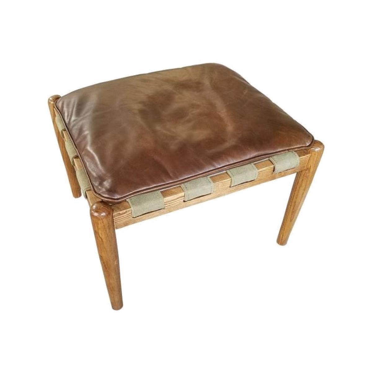 Add something a little special to your home with a Wiltshire piece. Sculpted arms and tapered legs form a sweeping line creating a stunning retro look. The stool exudes vintage style, yet the clean lines of the fabric seat give it an updated feel. Top with a comfortable brown leather cushion for the full two-tone effect. Upholstered in green-washed canvas Artistically shaped ash wood frame Antique brown leather cushion. Plastic caps on feet to protect the floor Gorgeous two-tone effect