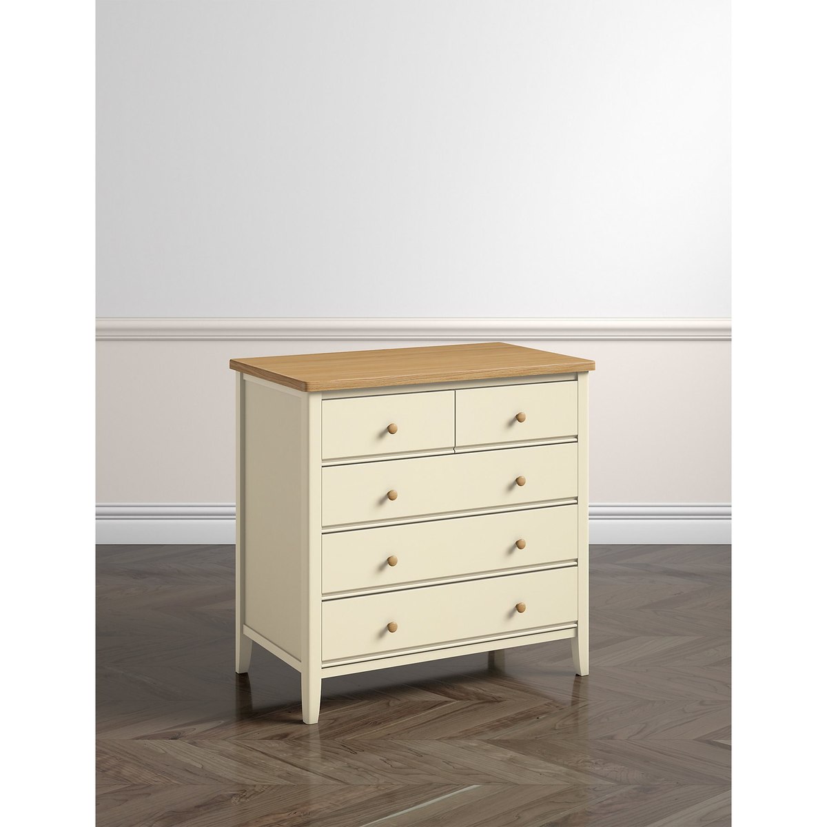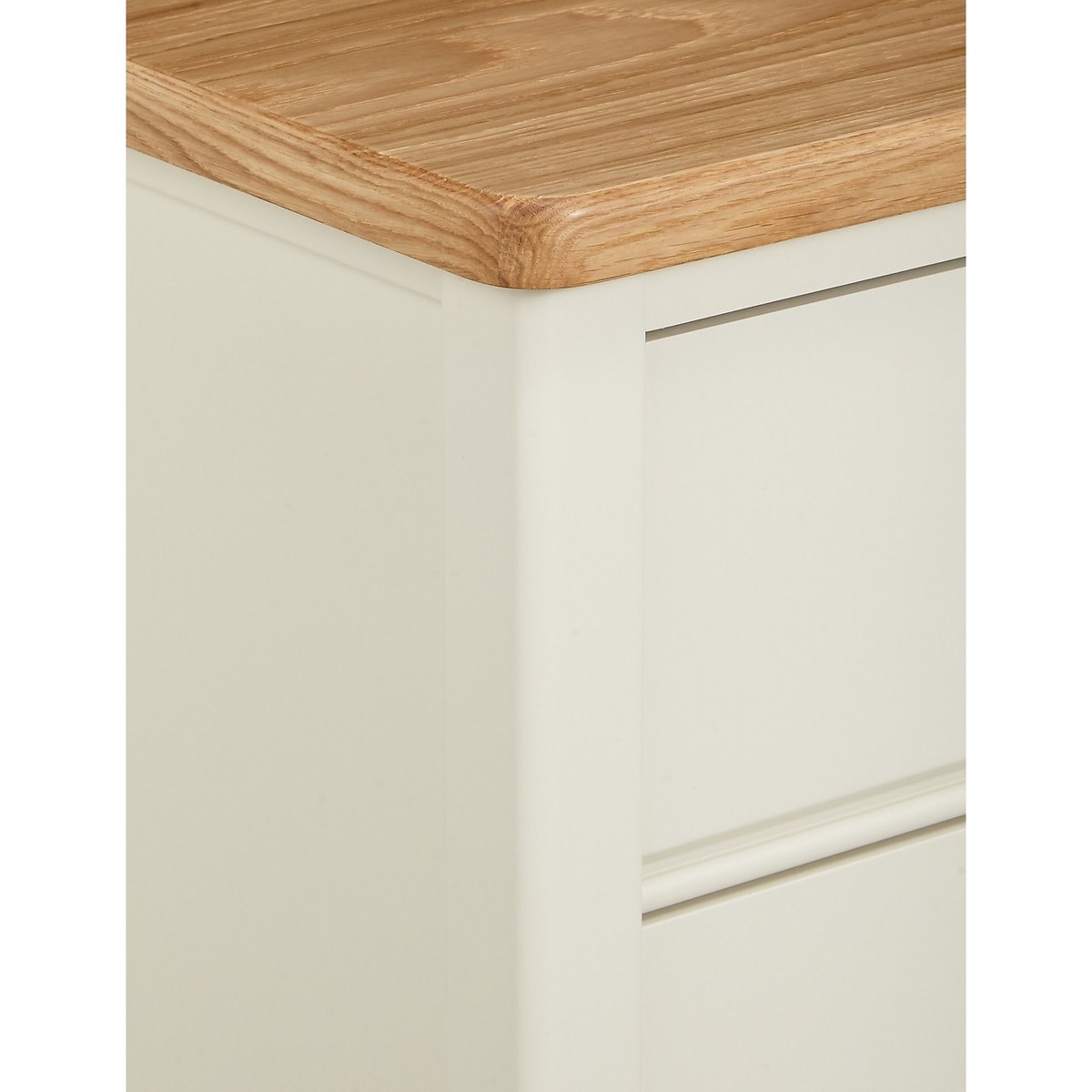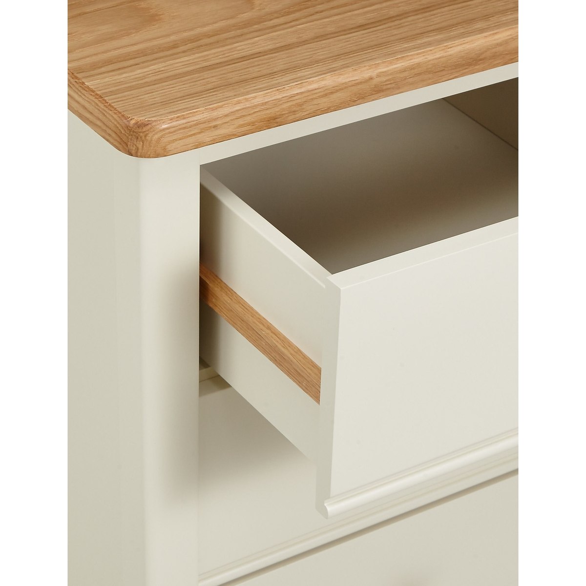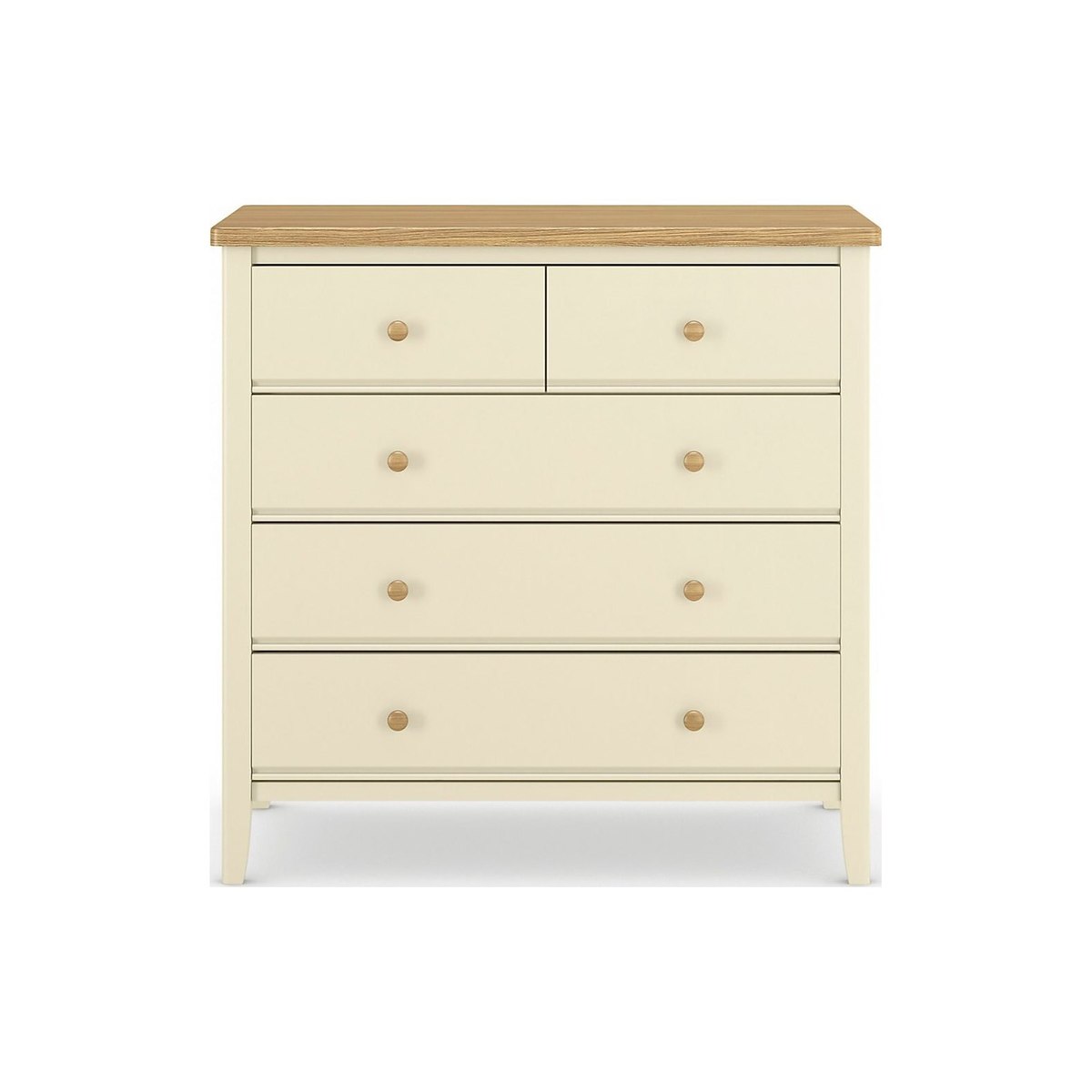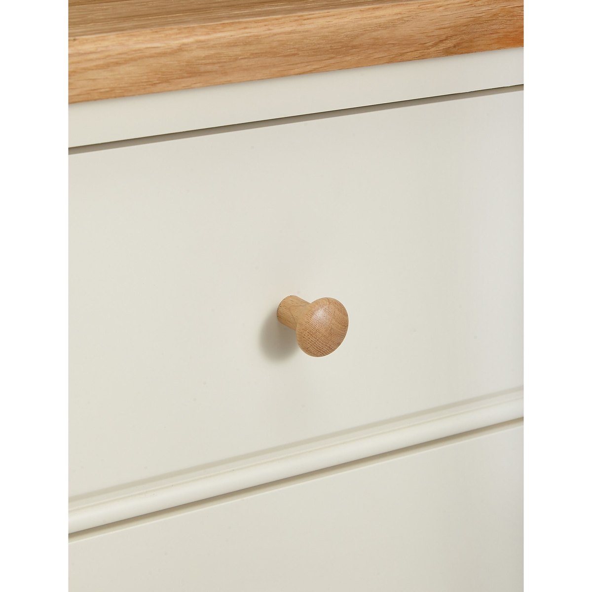 This lovely Winchester chest of drawers will improve your space and add some visual panache wherever you put it. Stylish and functional, this chest of drawers features a total of five drawers for all of your folded clothes and personal belongings. The overhanging wood coloured top contrasts wonderfully with the base, and the curved legs add additional visual interest. Masterfully crafted with sturdy oak, this chest also features a low shine veneer finish for added durability.