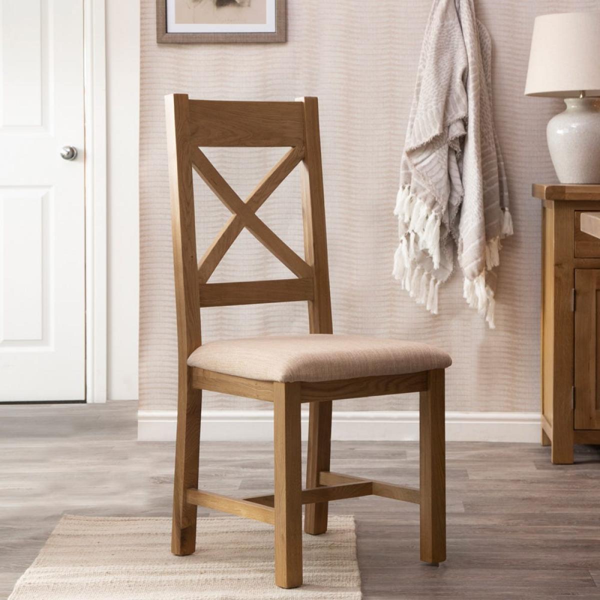 Your friends will thank you for comfortable chairs when your dinner party lasts into the night. Our Winchester oak cross back chairs with fabric seats keep everyone relaxed and supported. Their natural oak finish combined with a sturdy wood construction create a rustic appearance that’ll bring a welcoming feel when placed around a similar dining table. The seat pad has a height of 49 cm, and is made from a neutral check upholstery that will blend in with all colour schemes. These chairs come fully assembled, so they’re ready to go as soon as you are.