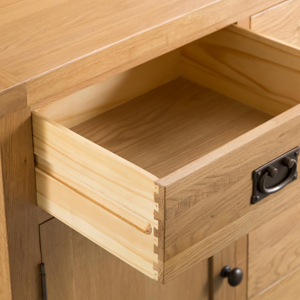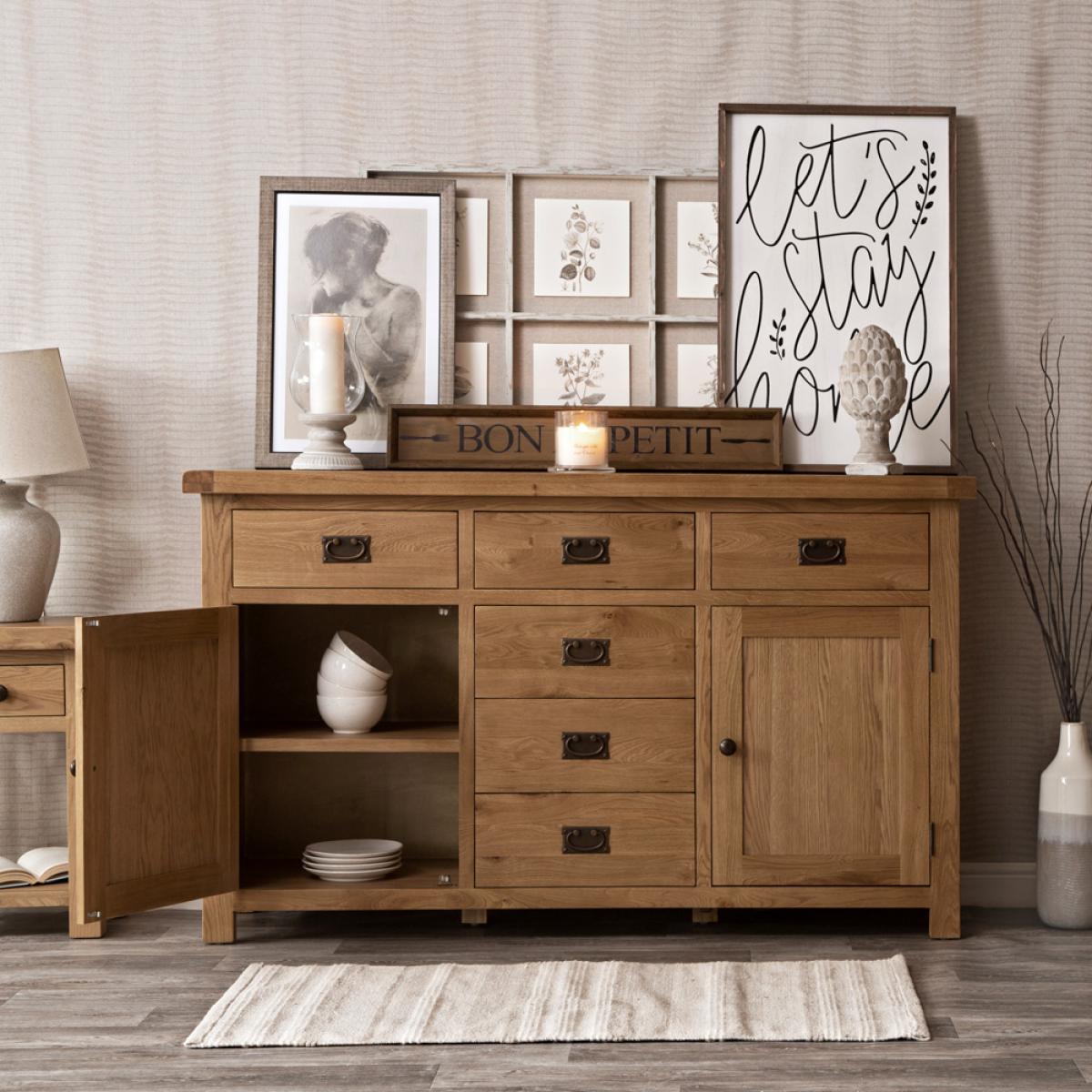 This sideboard is a versatile piece that works beautifully in both traditional and contemporary interiors thanks to its warm oak finish and practical design. I love how the Winchester looks both stylish and functional, offering ample storage with a mix of drawers and cupboards ideal for everything from cutlery to crockery or even media equipment. To style it, consider layering with a mix of decorative objects like vases or framed photos on top, and keep the clutter to a minimum for a clean look. It's particularly effective in dining rooms, living rooms, or even a hallway, adding a touch of natural warmth while providing plenty of space to keep things organised. For a balanced look, pair it with soft textiles or greenery nearby to soften the wood's rustic appeal.