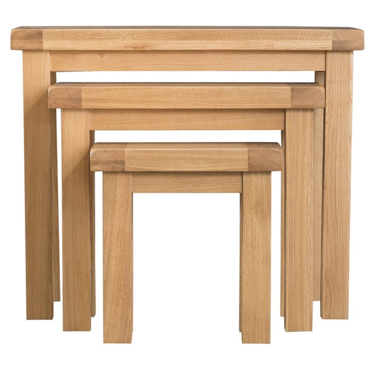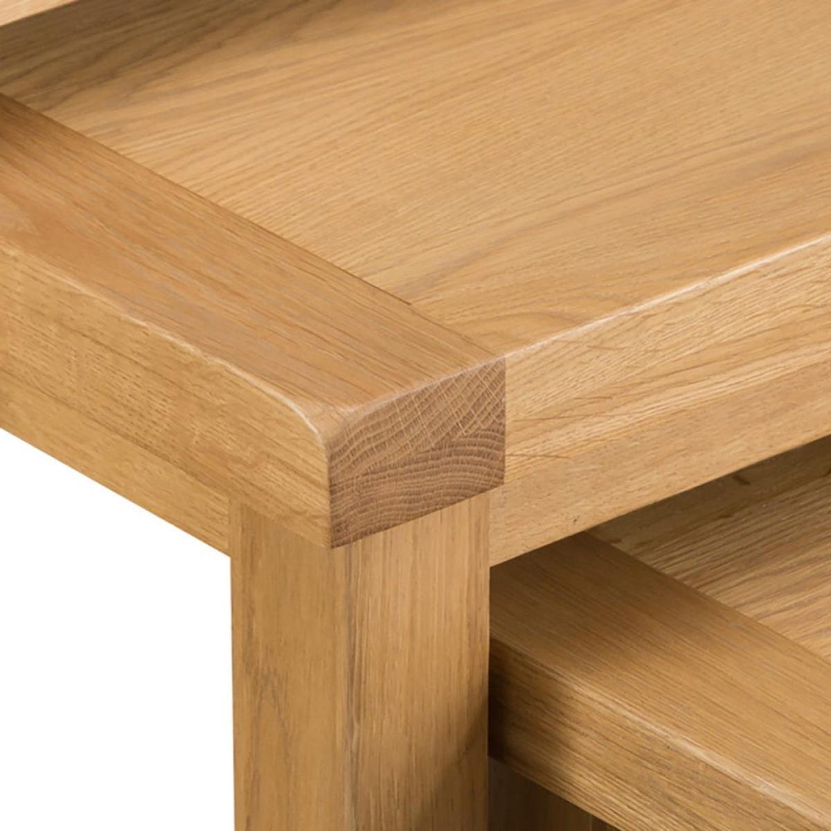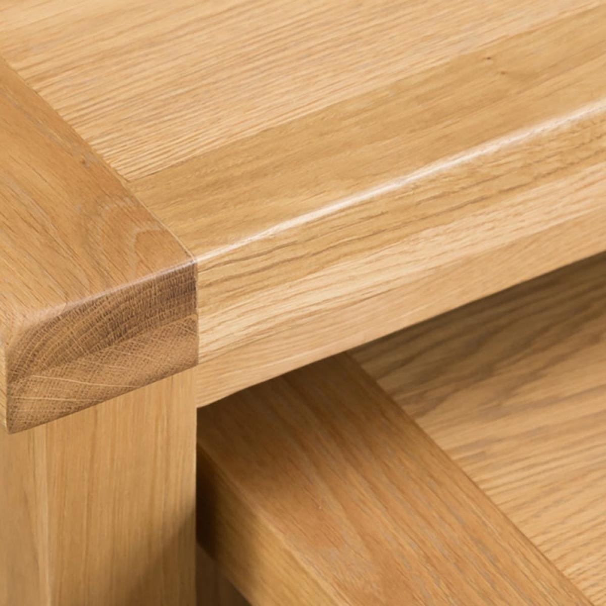 Our nifty Winchester Oak Nest of 3 Tables lets you maximise your surface space without taking over your living area. The trio of tables slot together in a single unit when not in use, and slide apart to accommodate drinks and snacks when you’re hosting a party. You can also use them as complementary display stands to show off lamps, houseplants or holiday snaps. These robust tables showcase the appealingly chunky frames and caramel hue that characterise our Winchester collection, and the combination of solid oak and oak veneer brings a traditional feel to your home.