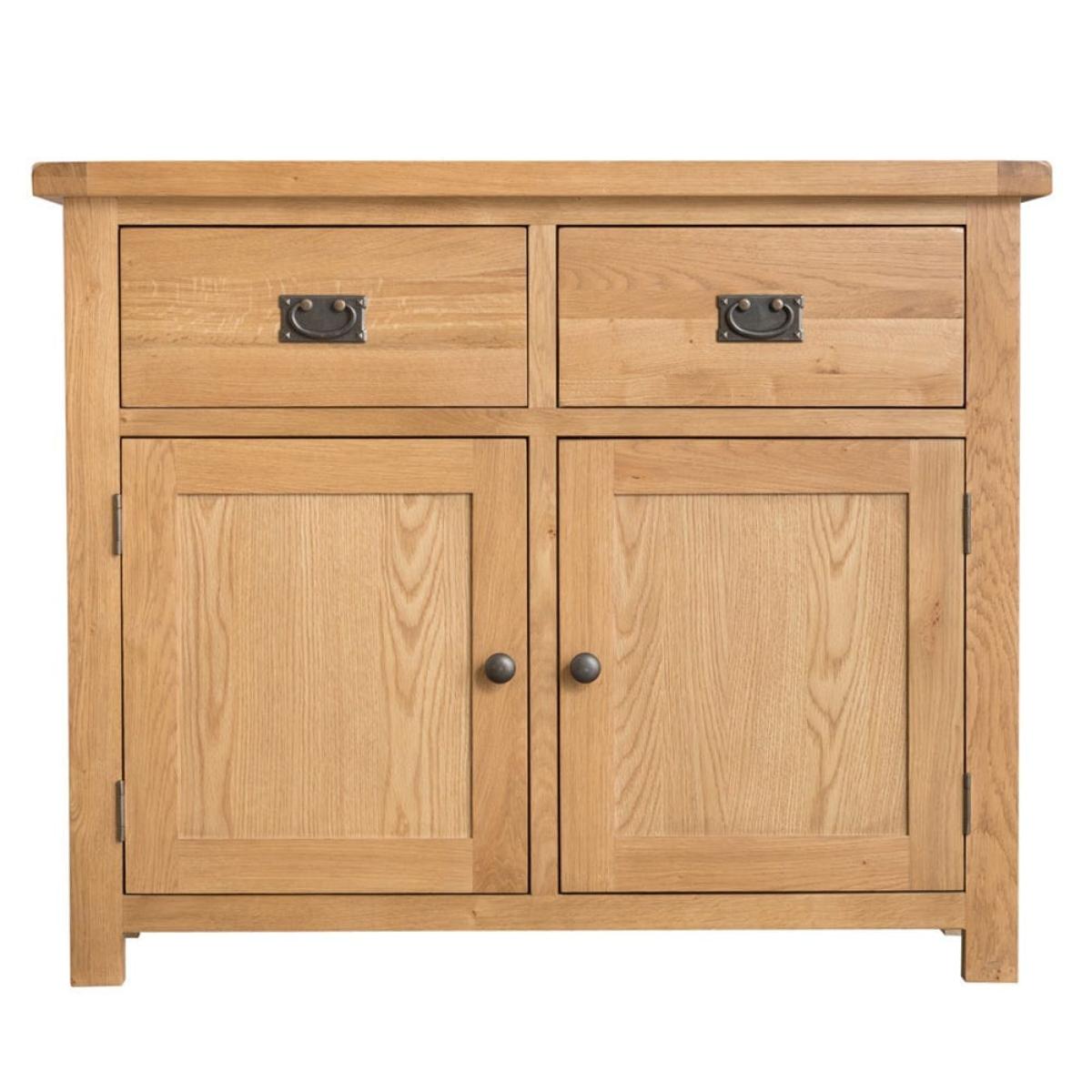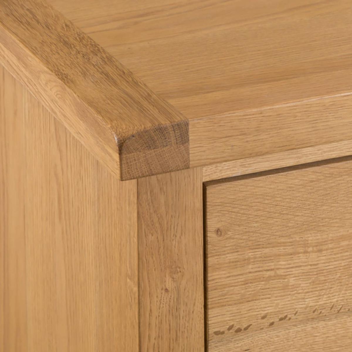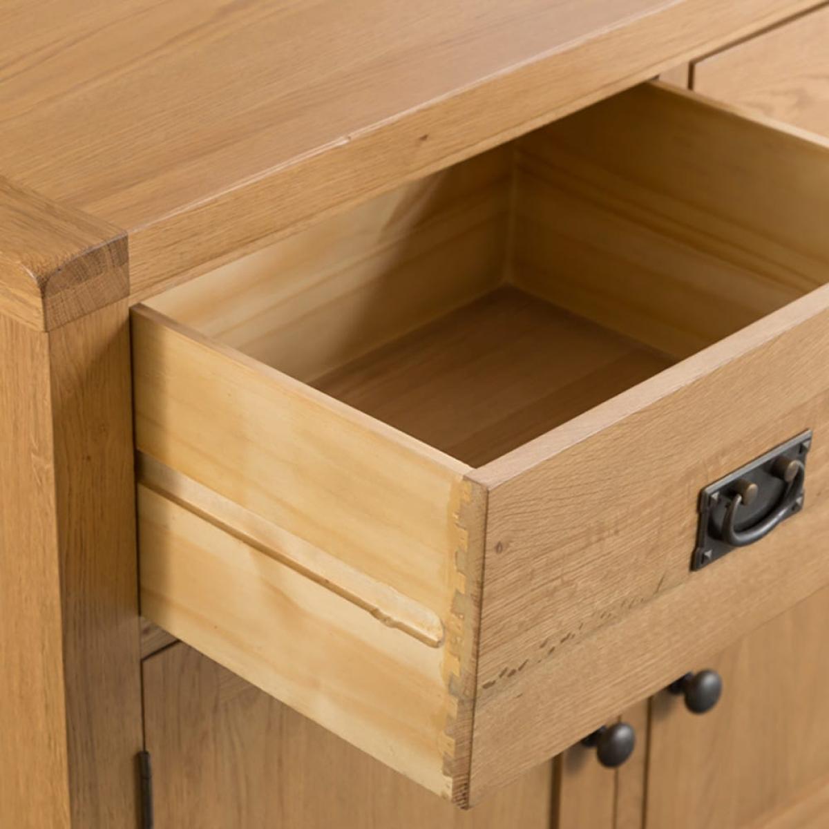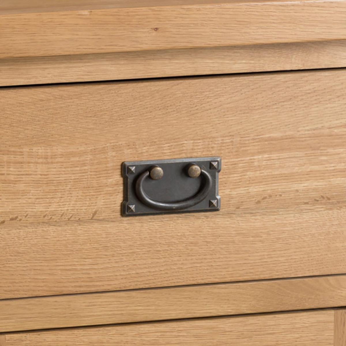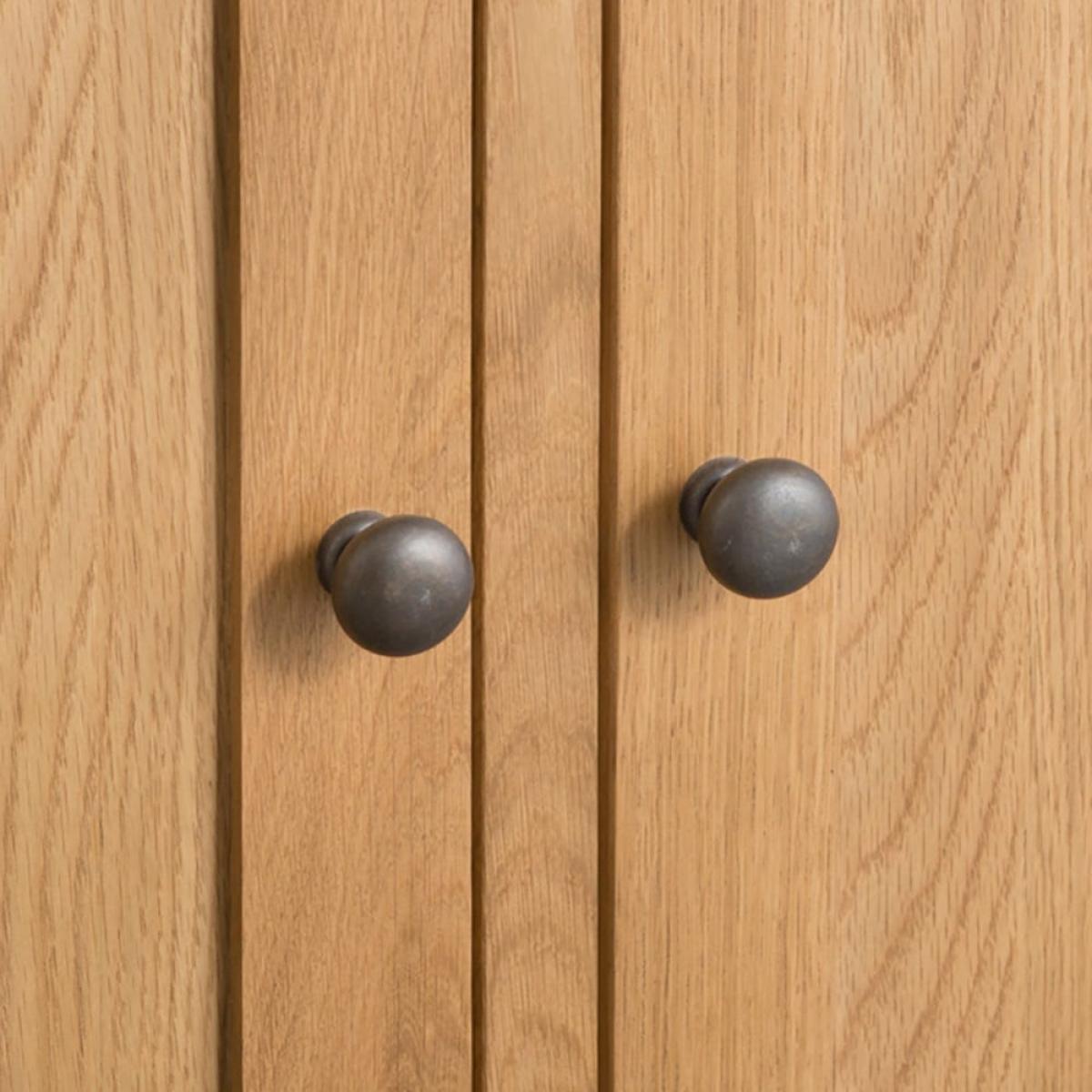Whether you use it for crockery or arts ‘n’ crafts, our Winchester oak small 2-door sideboard is sure to make a statement in your home. Its oak composition has an appealing caramel hue and plenty of natural features to complement both modern and traditional spaces. Brass-effect drawer handles and doorknobs add vintage details. The double cupboard has a pair of shelves for plates, serving dishes or glassware, and the spacious drawers are ideal for cutlery and table linen. Alternatively, use this sideboard to store games, puzzles and colouring books to keep kids occupied on rainy days indoors.