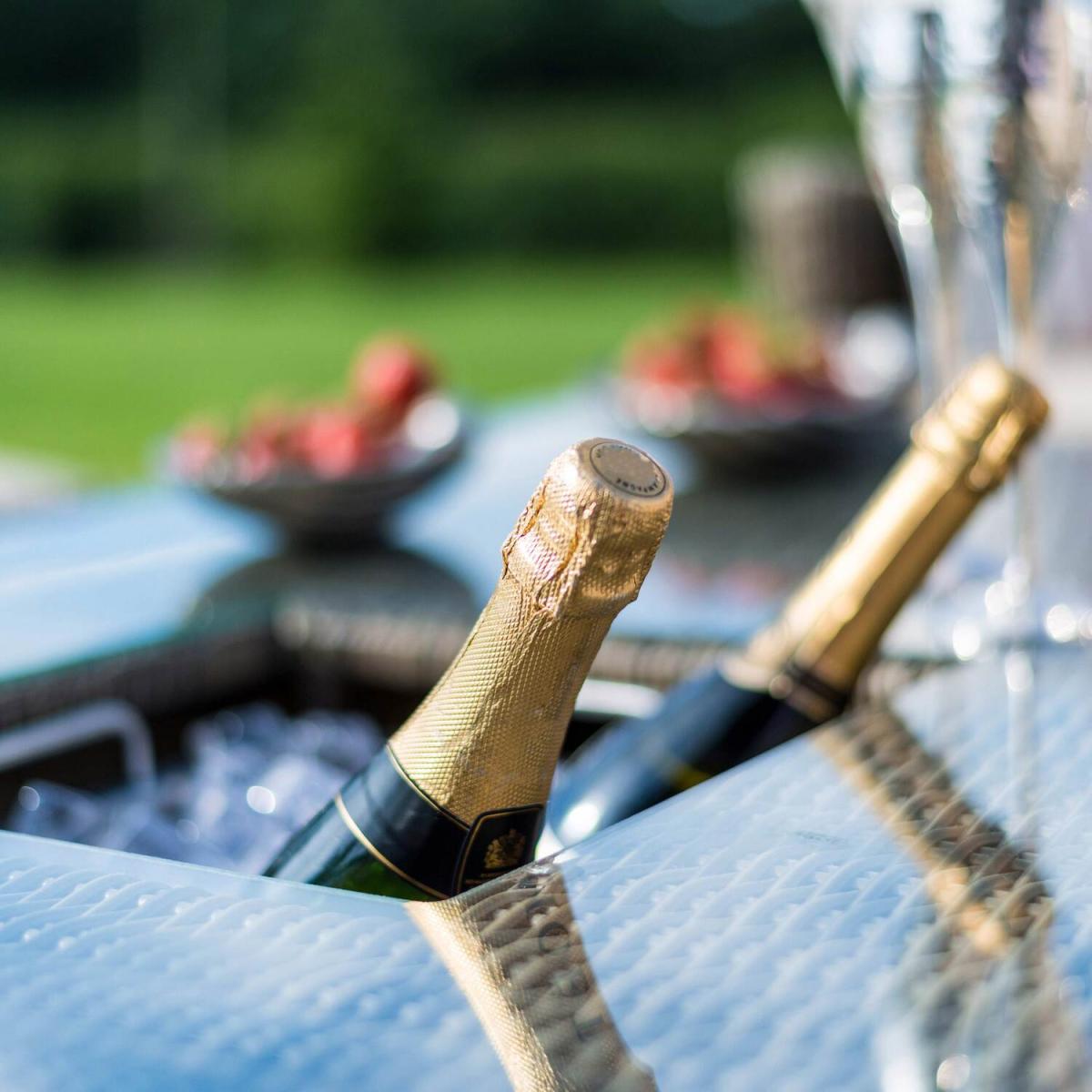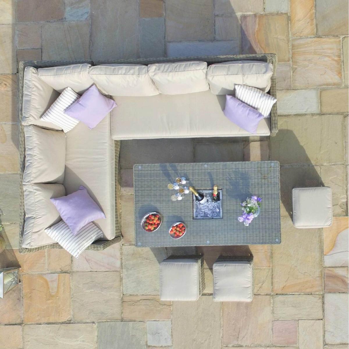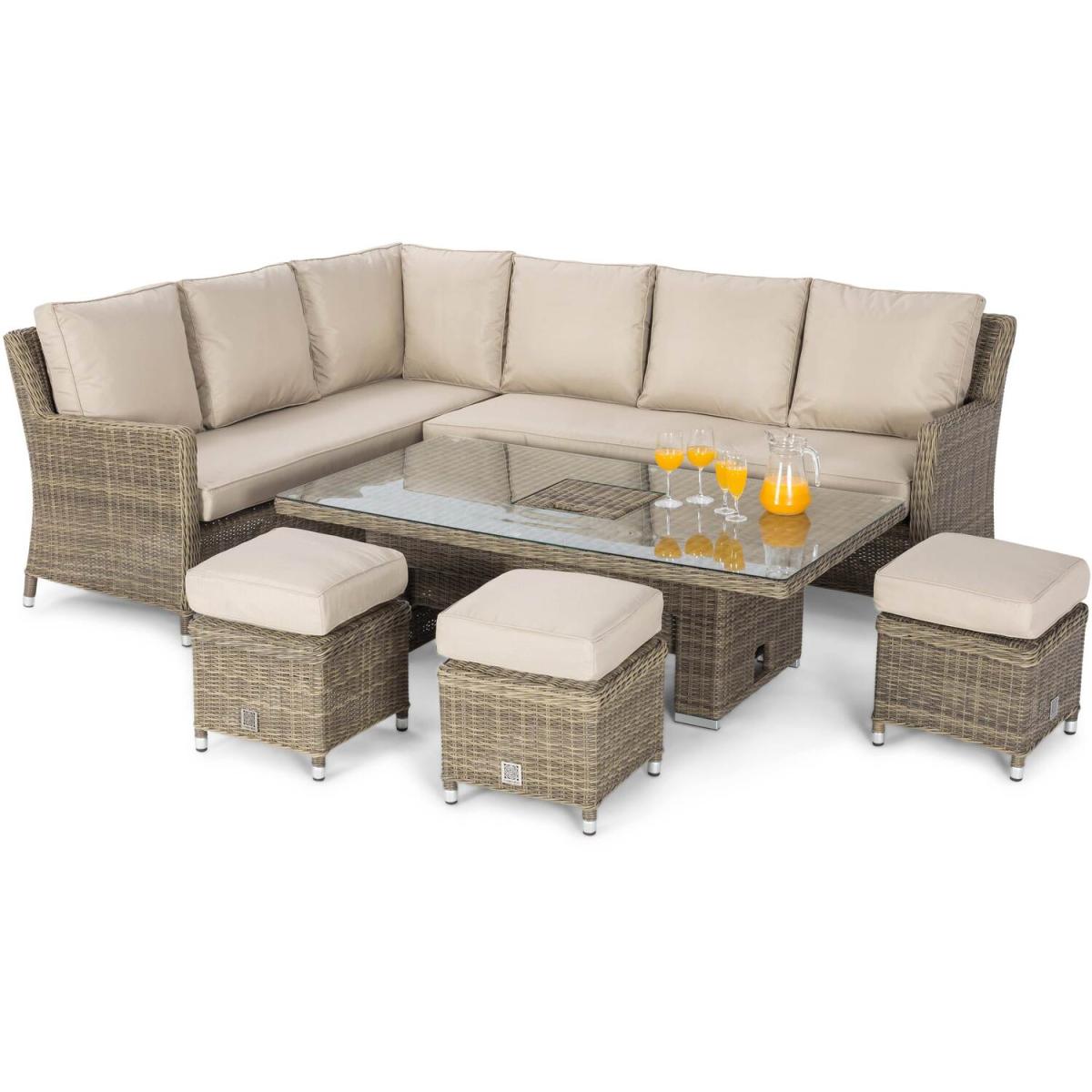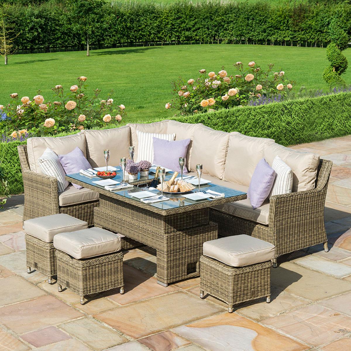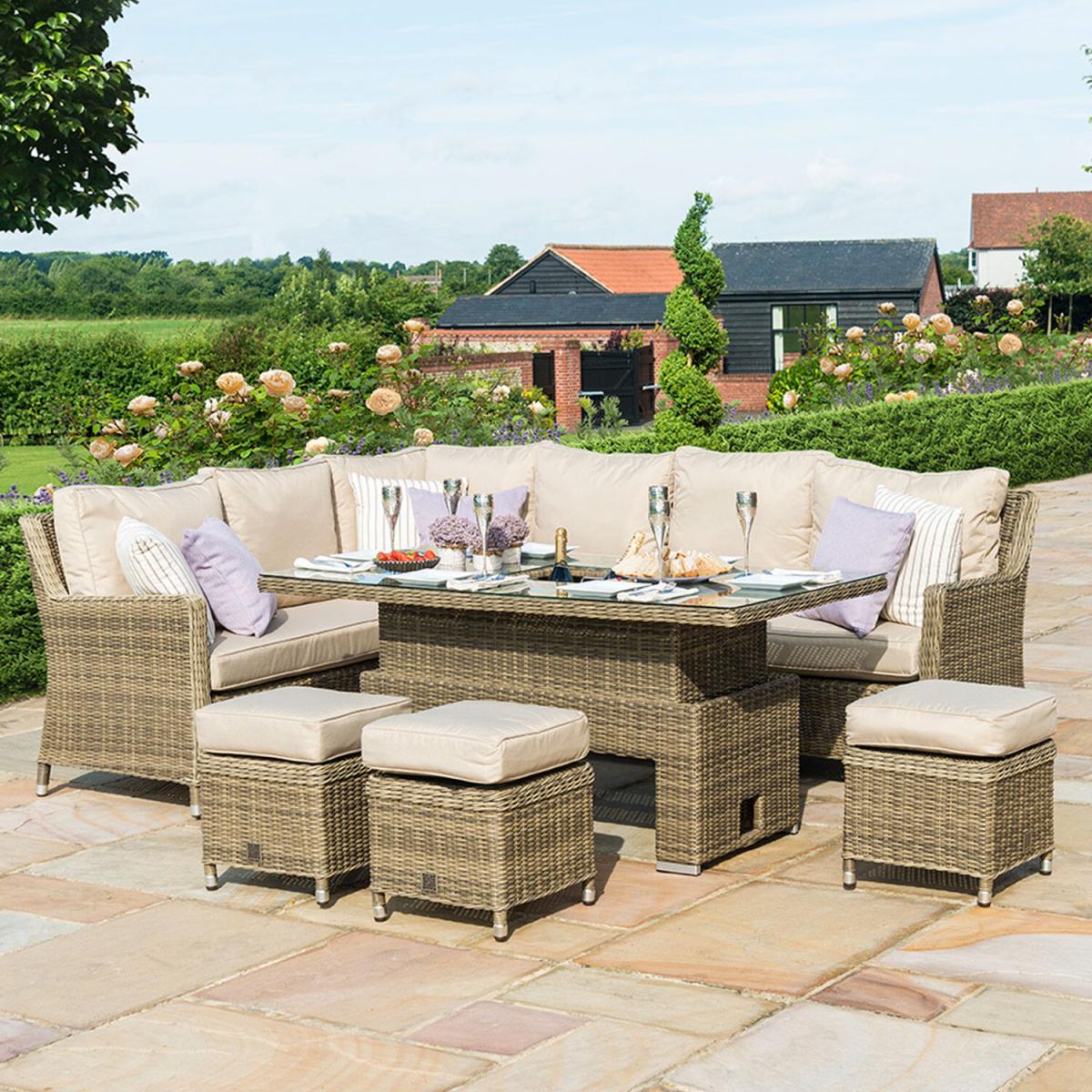 The Winchester Rattan Corner Dining Set is the ideal furniture for al fresco dining and socialising with friends and family. The high-quality Maze Rattan Set is perfect for those with larger gardens to be able to enjoy the outdoors in summer time and relax in style. The Winchester Dining Set comes complete with a large corner dining sofa with deep set cushions for added support and comfort and three footstools with cushions which can also be used as additional seats. The Maze Rattan garden set also includes a rectangular rising table with inset 8mm safety glass, to be able to adjust from coffee table to dining table with ease and a luxury integrated ice buckets perfect for socialising events.