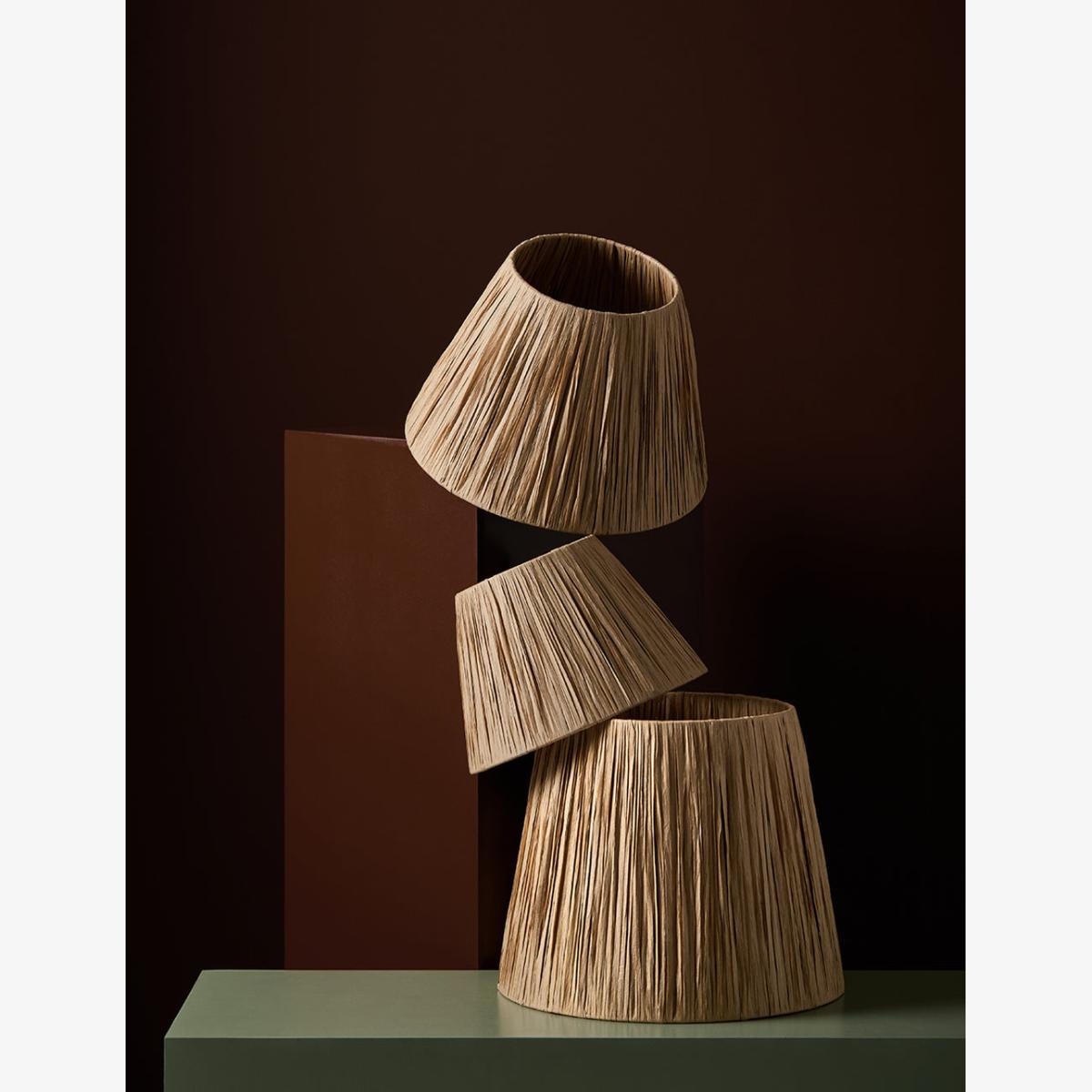 Beautiful honey toned natural shade in Raffia (the product of palm leaves). The Raffia is wound over the base of the shade giving you a layered and organic look. Lets slithers of light through and offers a warm, glowing light. Large 32cm tapered shade Also available in a Small and Medium size A large 32cm natural Raffia lamp shade suitable for floor lamps