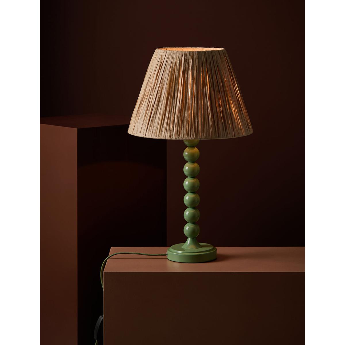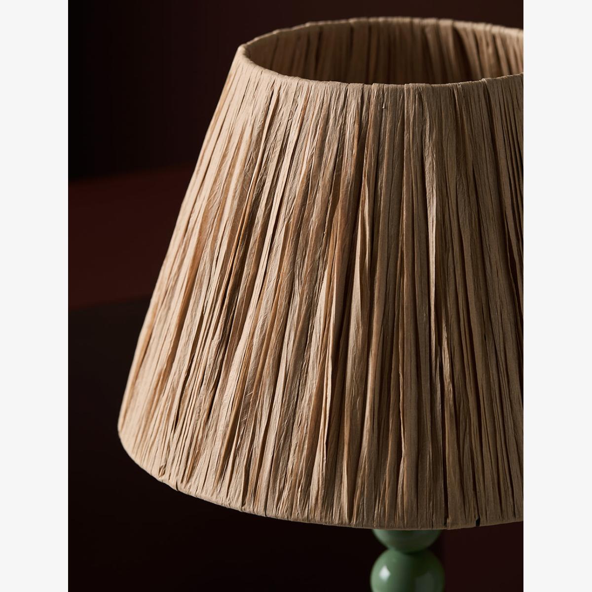 Beautiful honey toned natural shade in Raffia (the product of palm leaves). The Raffia is wound over the base of the shade giving you a layered and organic look. Lets slithers of light through and offers a warm, glowing light. 30cm tapered shade Also available in a Small and Large size. Styled here with our Thimble Lamp in Moss Green A medium 30cm natural Raffia lamp shade for table lamps