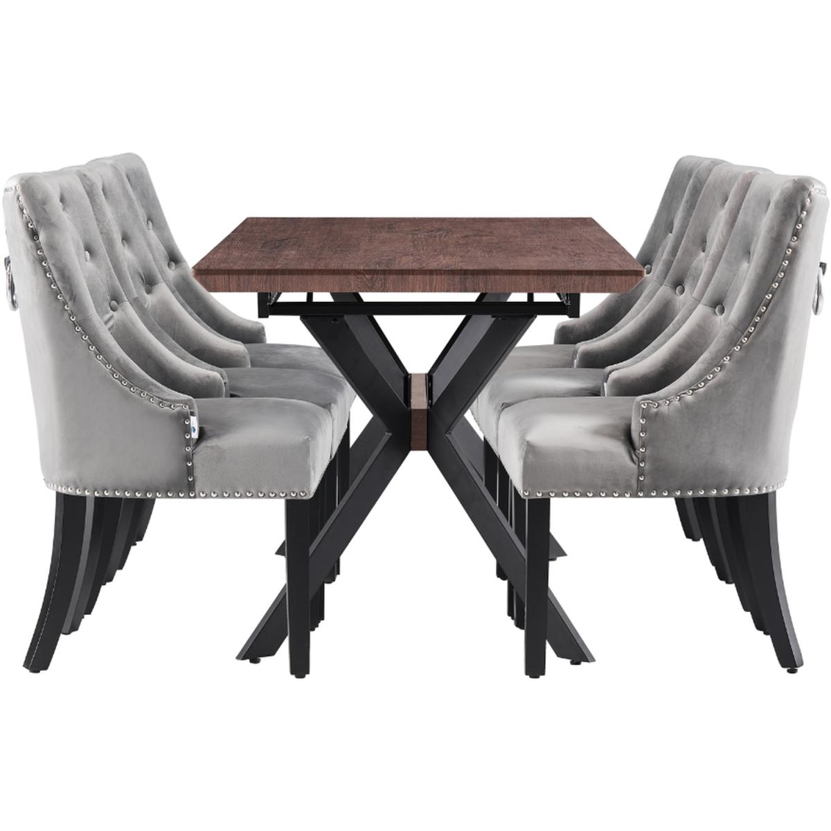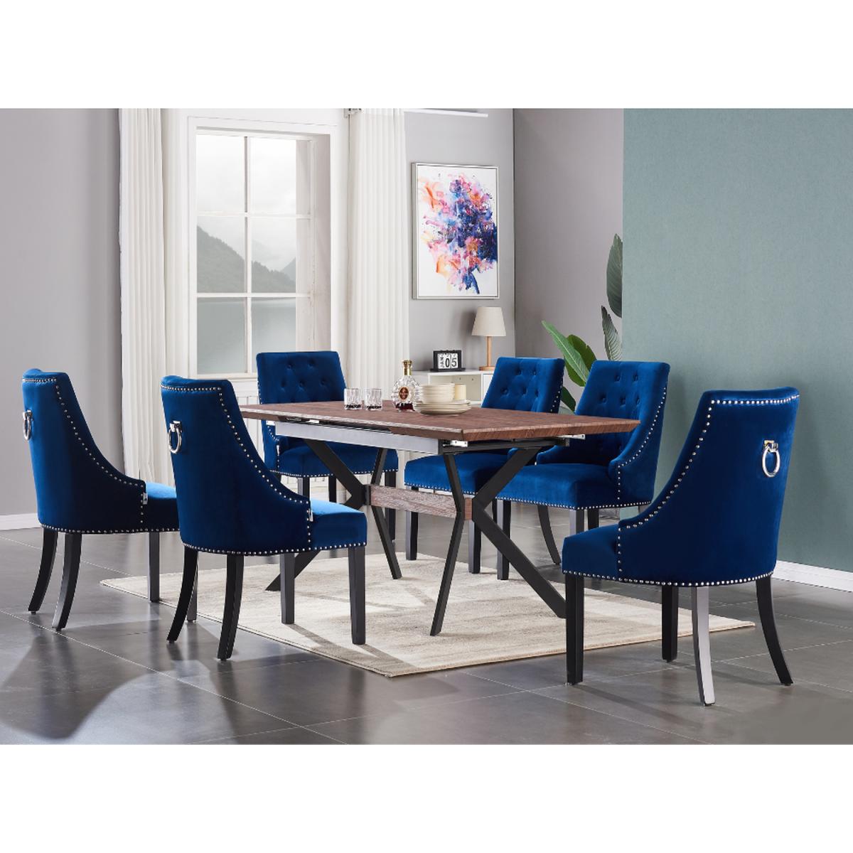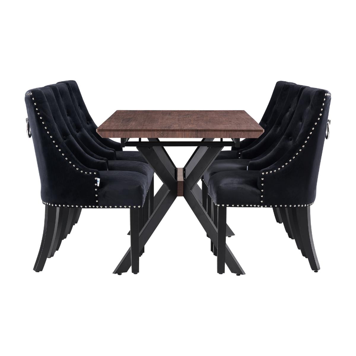 The dining set of 6 includes a sleek design Blaze Rectangle Dining Table that nods to the evergreen aesthetic and functionality of iconic mid-century modern furniture. Simply pull the table ends apart and an extra leaf pops into place allowing you to seat six with ease. The base is the sculptural cross-shaped design of legs in black powder-coated MDF. The table comes with a set of 6 Windsor Dining Chairs that feature designer curves, Sweeping arches, and Soft edges. Beautiful diamond tufting, metal stud work, and a knocker handle on the rear refine the look. Softly textured and wonderfully comfortable. Our Windsor chairs are made using high-grade fabric weaves, with a natural feel that is also easy to clean. Created with comfort in mind, the Windsor has a foam filling you'll sink into. The backrest curves to your body for superior comfort.
