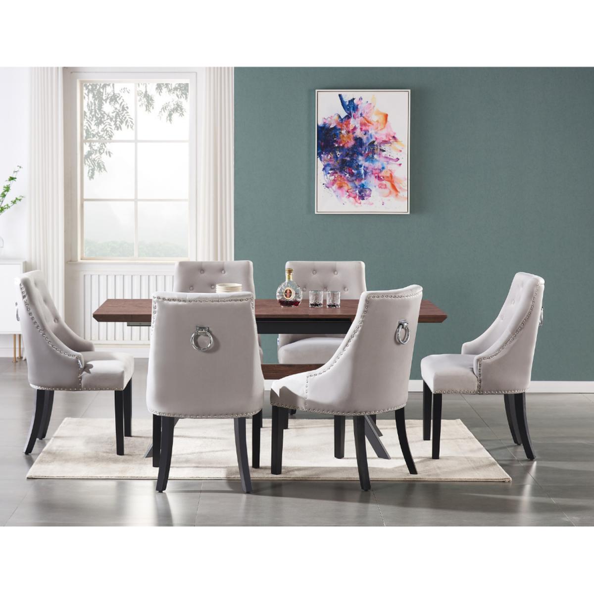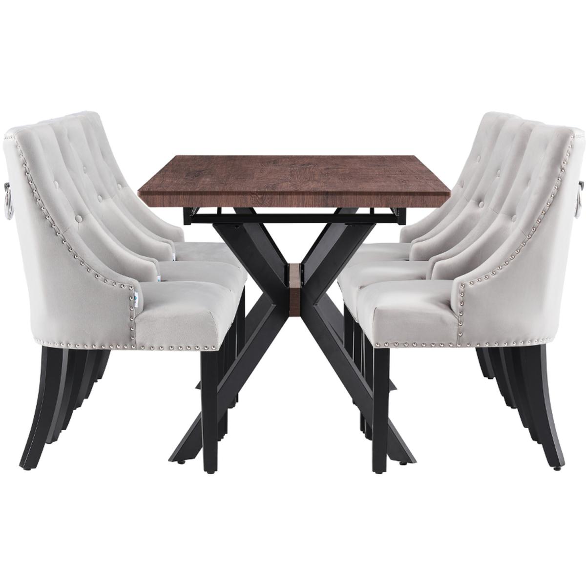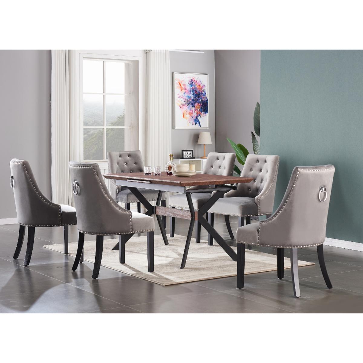 The dining set of 6 includes a sleek design Blaze Rectangle Dining Table that nods to the evergreen aesthetic and functionality of iconic mid-century modern furniture. Simply pull the table ends apart and an extra leaf pops into place allowing you to seat six with ease. The base is the sculptural cross-shaped design of legs in black powder-coated MDF. The table comes with a set of 6 Windsor Dining Chairs that feature designer curves, Sweeping arches, and Soft edges. Beautiful diamond tufting, metal stud work, and a knocker handle on the rear refine the look. Softly textured and wonderfully comfortable. Our Windsor chairs are made using high-grade fabric weaves, with a natural feel that is also easy to clean. Created with comfort in mind, the Windsor has a foam filling you'll sink into. The backrest curves to your body for superior comfort.