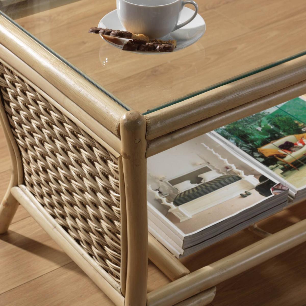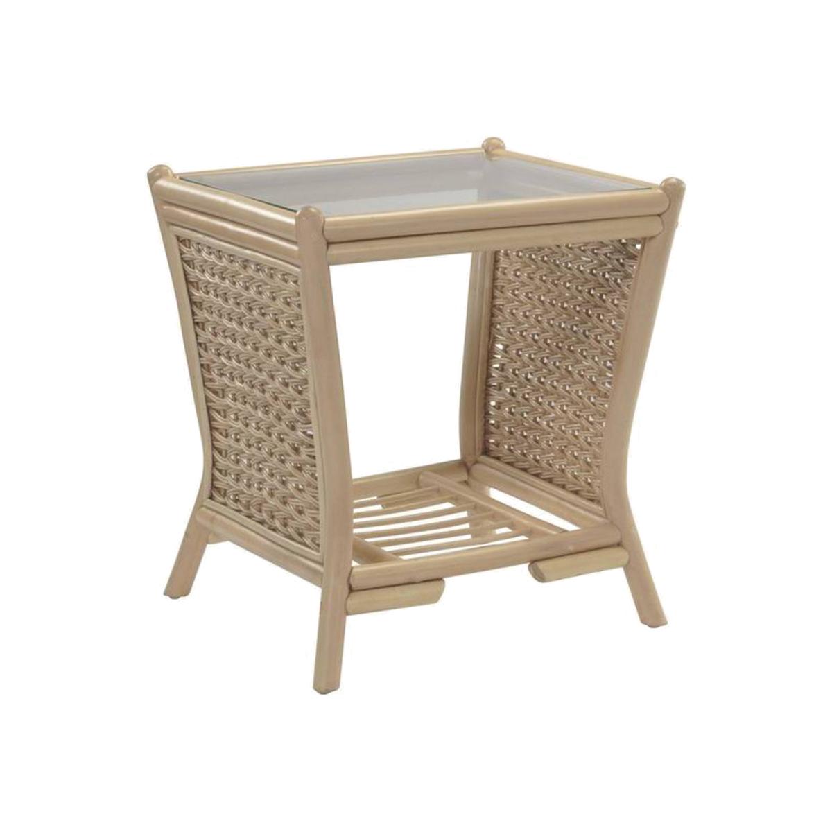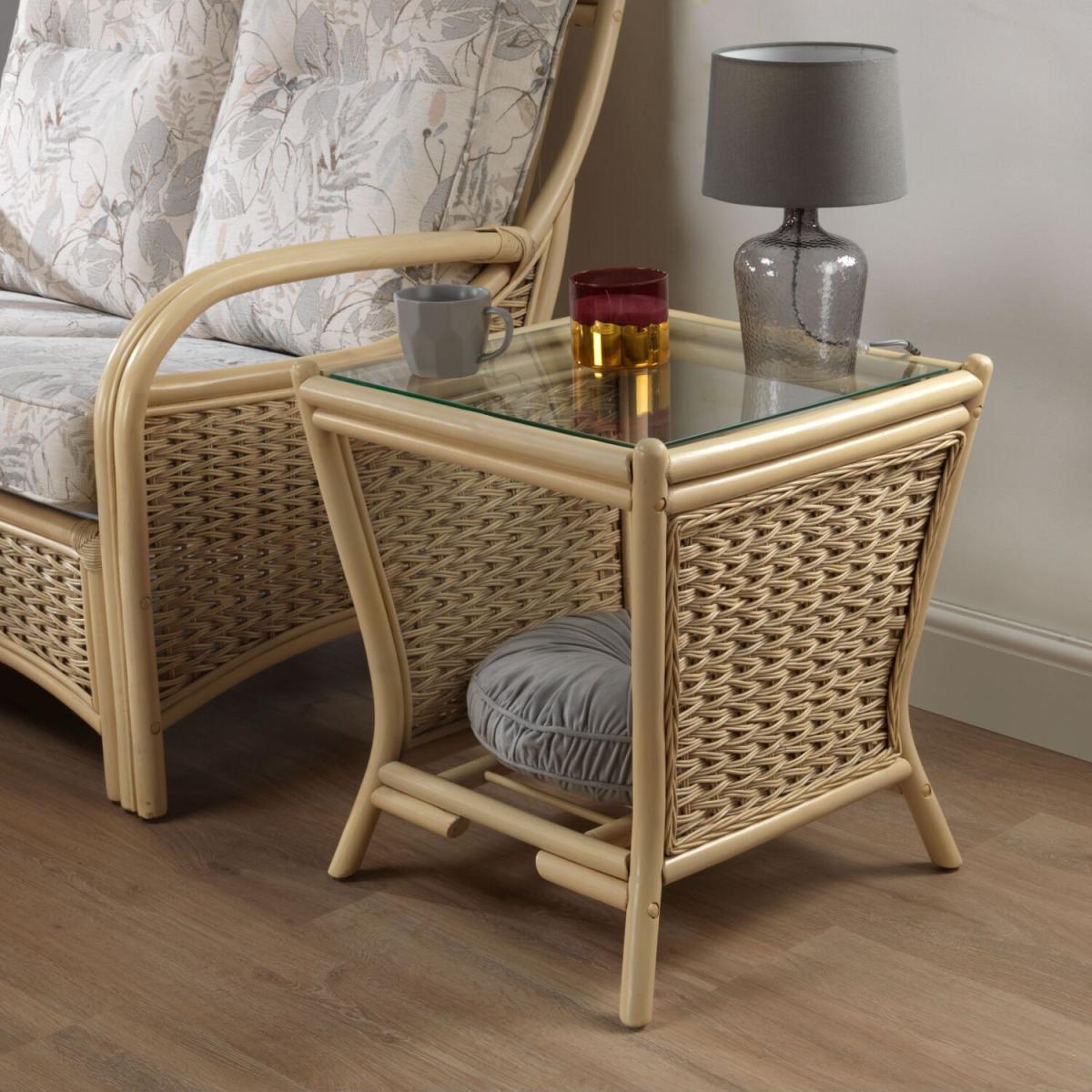 A sustainable natural rattan lamp table with 5mm toughened glass top and bottom shelf