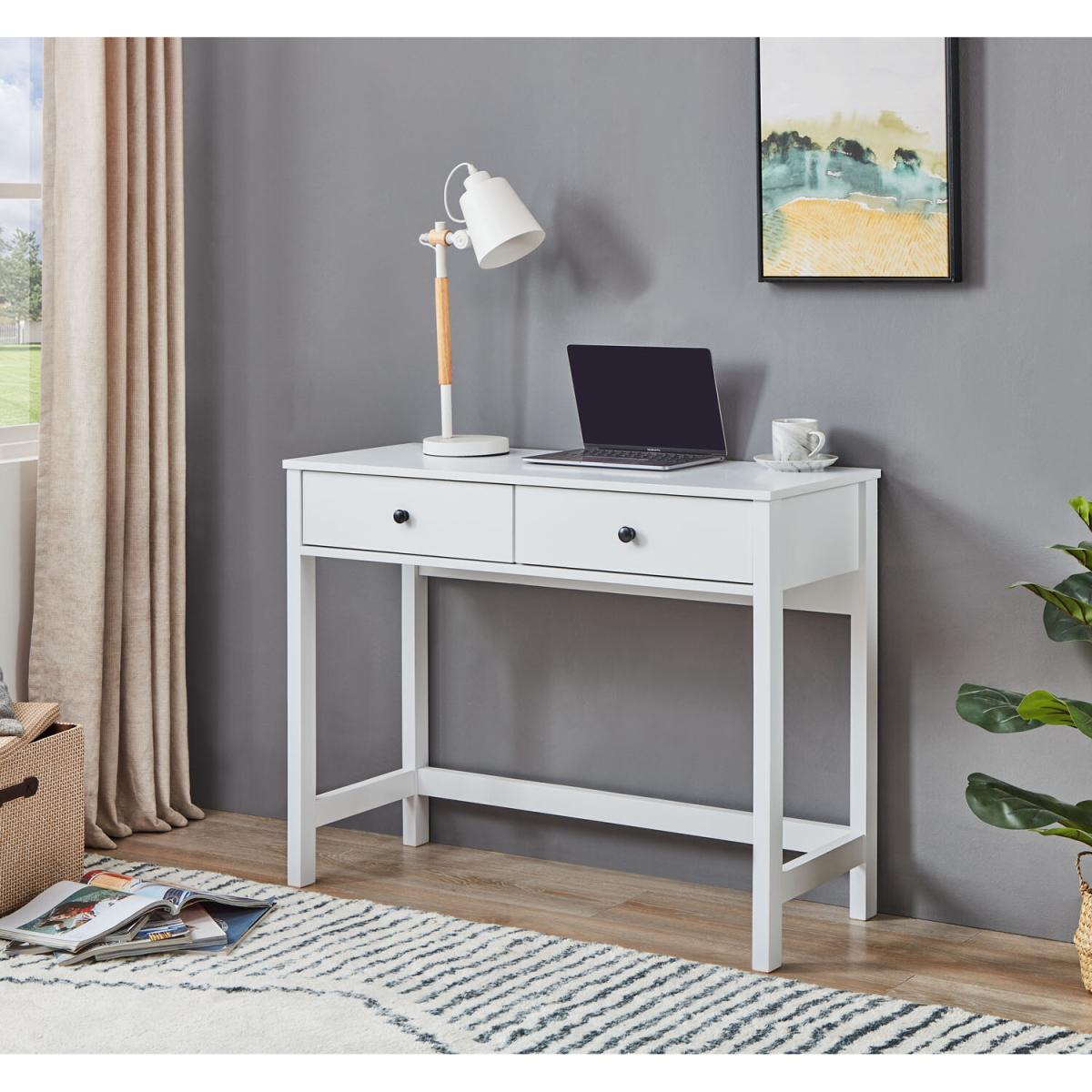 Designed with modern simplicity in mind, the Windsor Dressing Table is sleek and minimalist with clean corners and a white wood finish. Bringing elegance to any space, this functional and stylish unit features a durable wood frame and one drawers that slides out to reveal ample storage room for all of your cosmetics, trinkets, and other belongings.