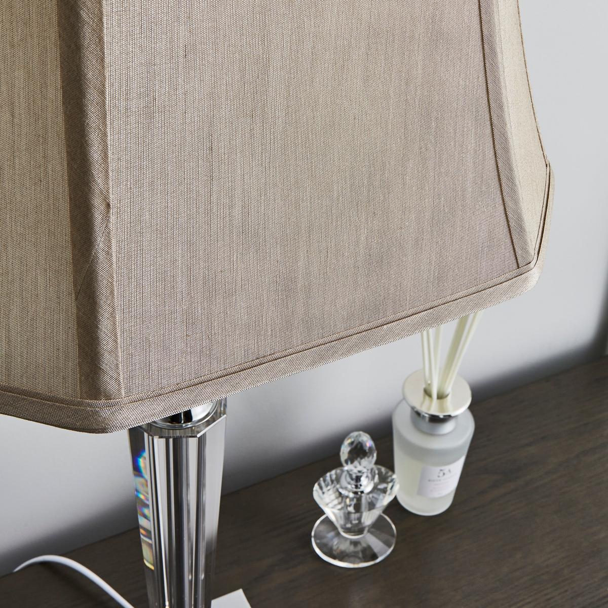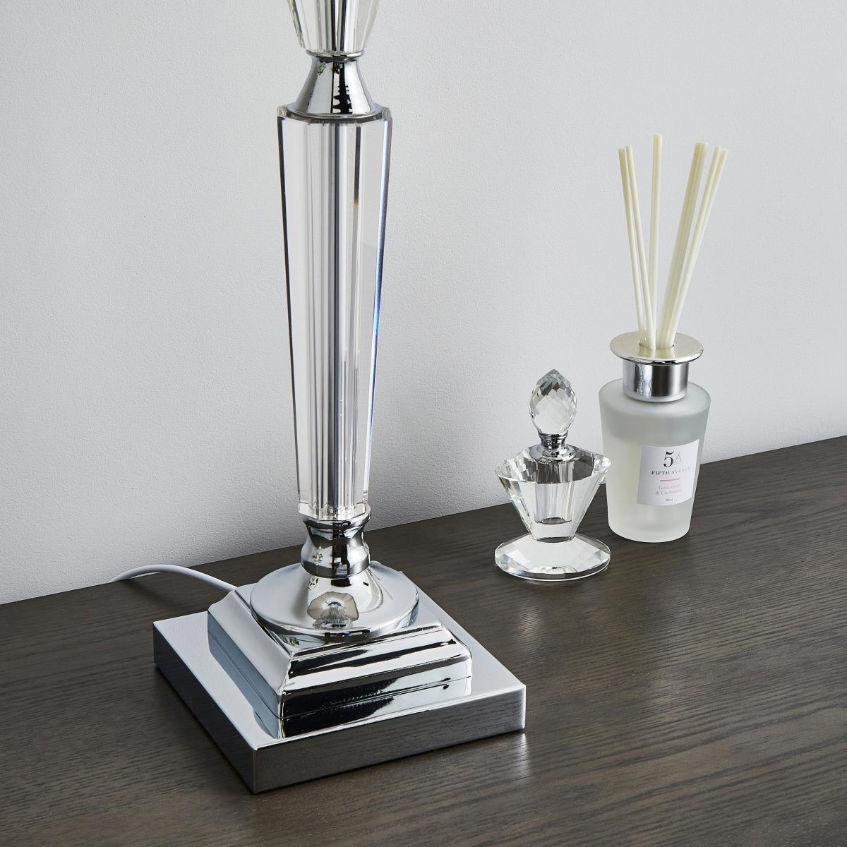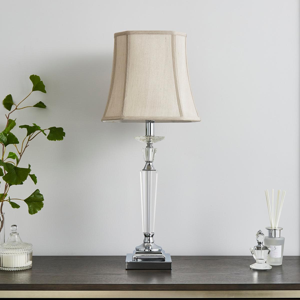Fashioned with an elegant chrome stem with glass detailing, this table lamp will be a beautiful addition to any room. A silver faux silk shade is include with the table lamp. This table lamp requires 1 x Candle SES (E14) - 7W which is not included with the lamp. The table lamp comes with a 1. 8m white cable and an in-line switch.