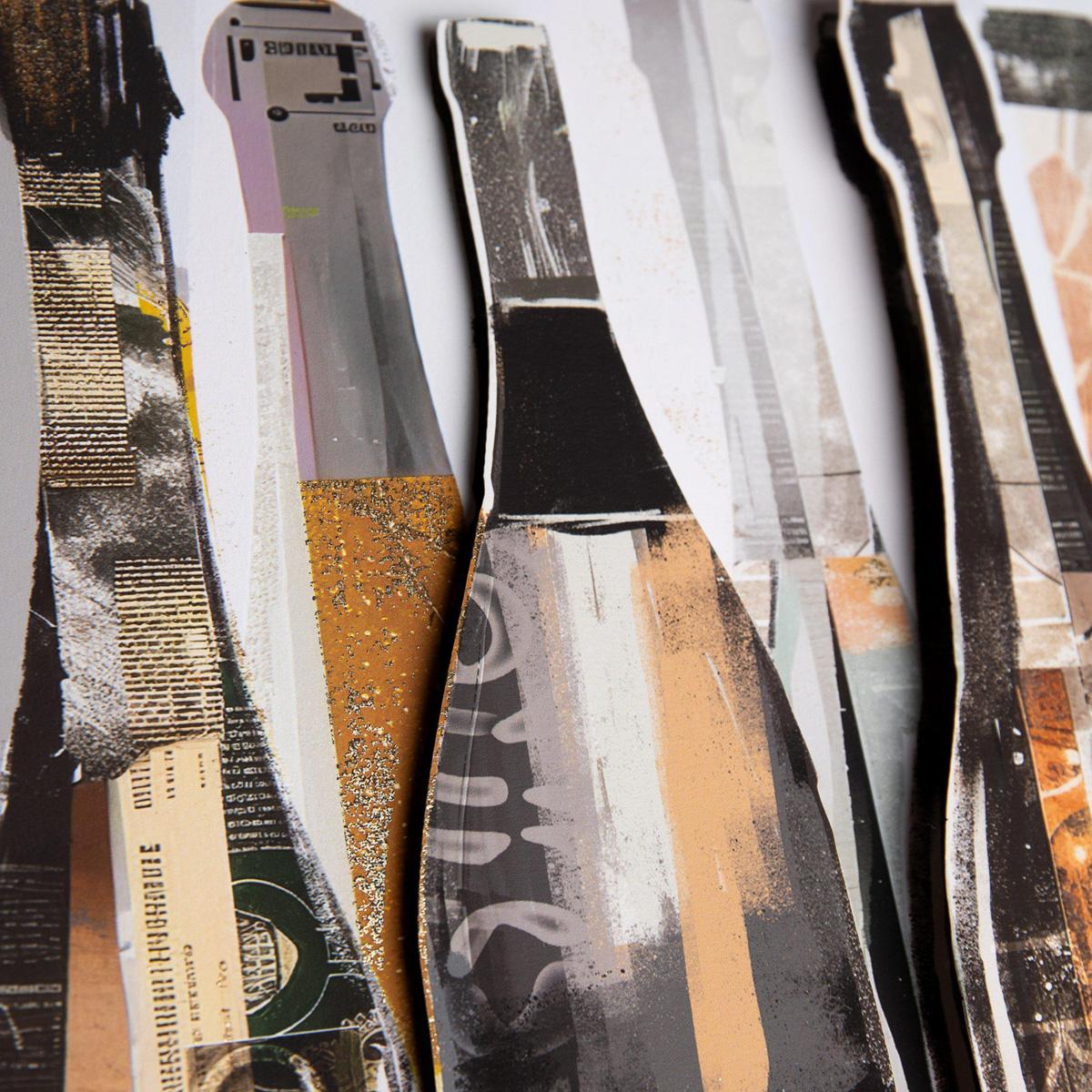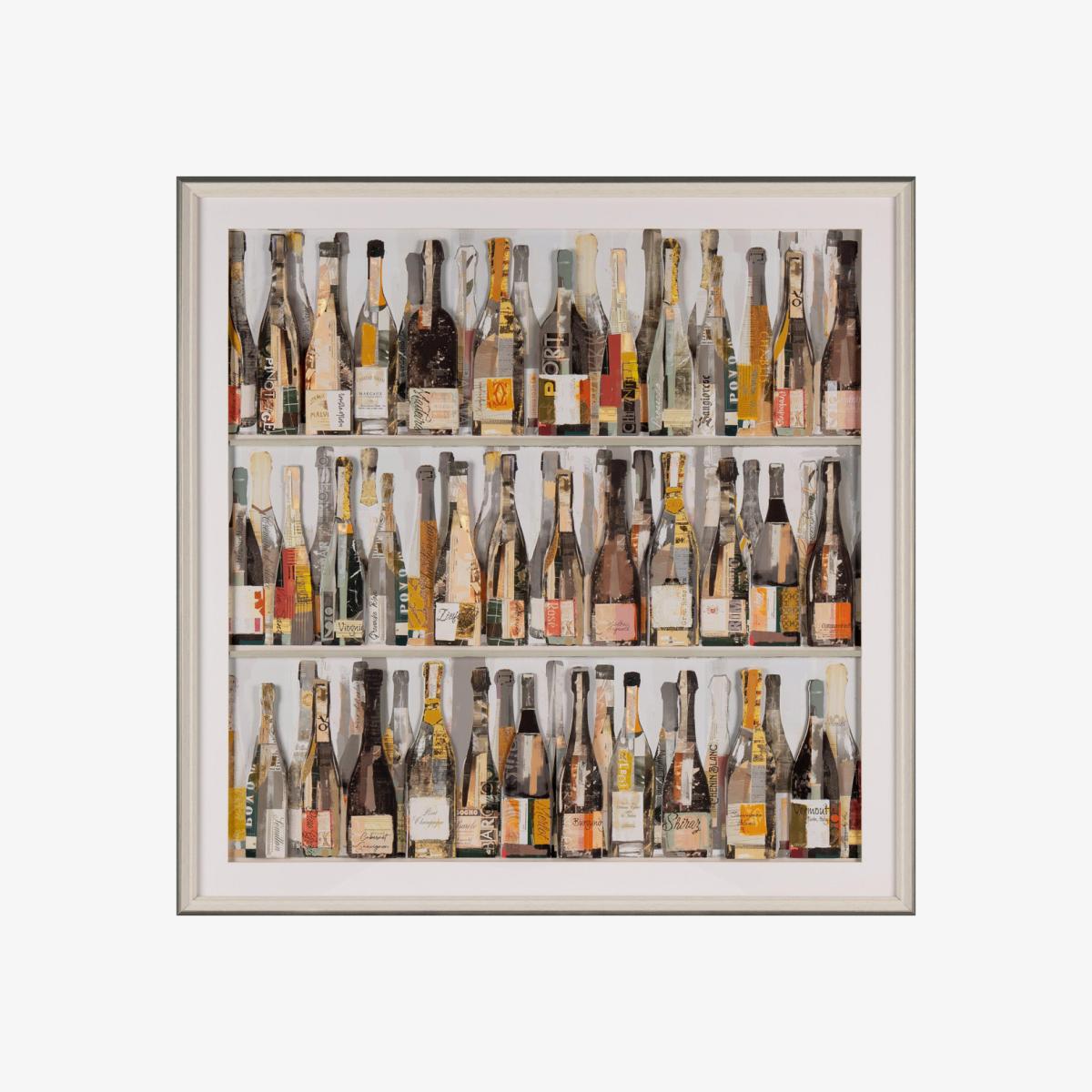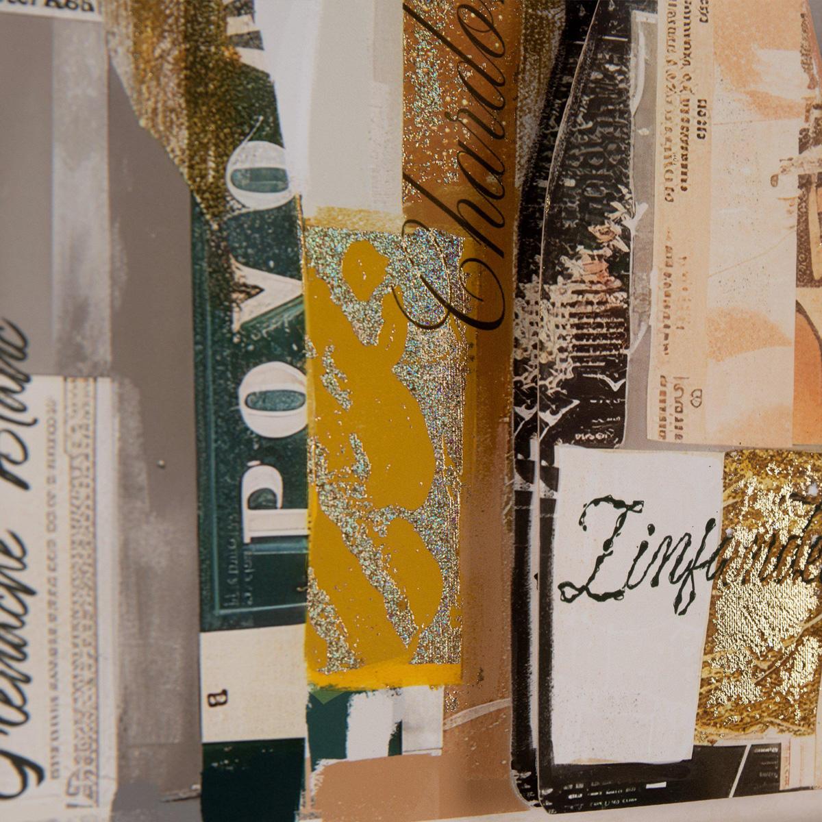 Raise a glass to artistic elegance with this captivating wall art that features a collection of wine bottles layered in a striking collage effect and enhanced with varying textures and depth. Metallic foil accents catch the light, making the piece come to life, making this the perfect luxurious addition to a kitchen, dining room or bar area.