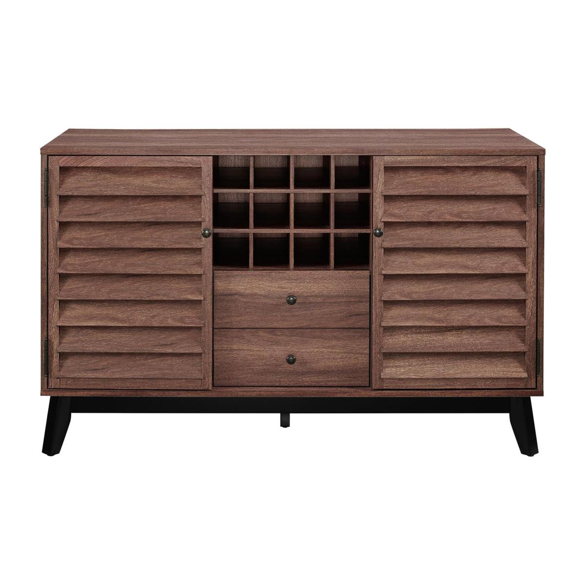 Bring the party to your dining room or living room with the Ameriwood Home Vaughn Wine Cabinet. This Wine Cabinet features multiple different types of storage with its 12 bottle cubbies, 1 drawer and 4 shelves. You can keep anything from your favorite wines, wine glasses and bottle openers in this Wine Cabinet for a one-stop-shop to a good time. The 4 shelves (2 adjustable) are behind louvered doors to keep your items out of sight but still right where you need them. The single drawer gives the illusion of 2 drawers with its double knobs and grooved drawer front but offers a deeper space to keep items. The mid-century look of this Wine Cabinet is made with laminated particleboard, MDF, wood veneer and solid wood for a strong build that will last for years and is finished in grey weathered oak or walnut.