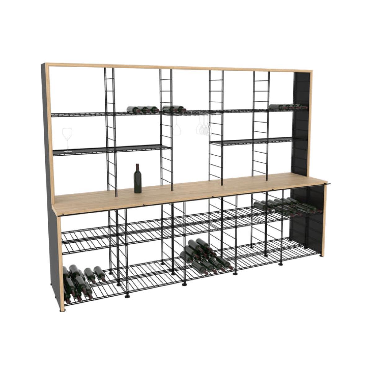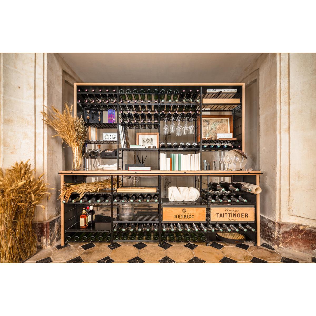 Create your own personal wine library! This wine shelf with built-in tasting counter lets you create a space dedicated to wine and sharing at home: in an entrance, living room, large kitchen, a fitted cellar. This counter lets you taste and store your favourite bottles of wine. For a friendly, relaxed tasting among enlightened amateurs (or maybe not), looking for a good food-wine pairing. Displayed in its wood and metal case, your collection of bottles can be read directly by guests gathered around the counter. The steel wire shelves can hold up to 1000 bottles. The built-in glass rack can hold 18 stemmed glasses. Four solid sheet metal shelves (to arrange freely on the wire shelves) let you put your various accessories on them. The materials used are durable and authentic: steel and solid oak. The precise way the materials are fitted together and assembled guarantees strength and aesthetic consistency. This uncluttered, aesthetic piece of furniture fits easily into the most varied environments, whether it’s a living room or wine storage area. This wine rack / tasting counter is equally at home in private and public environments: restaurants, wine bars, wineries, wine cellars, reception venues.