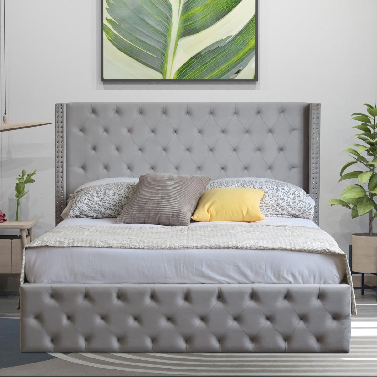 Winged Plush Velvet Fabric Ottoman Gas Lift Up Storage Bed Frame with Headboard - Light Grey / King