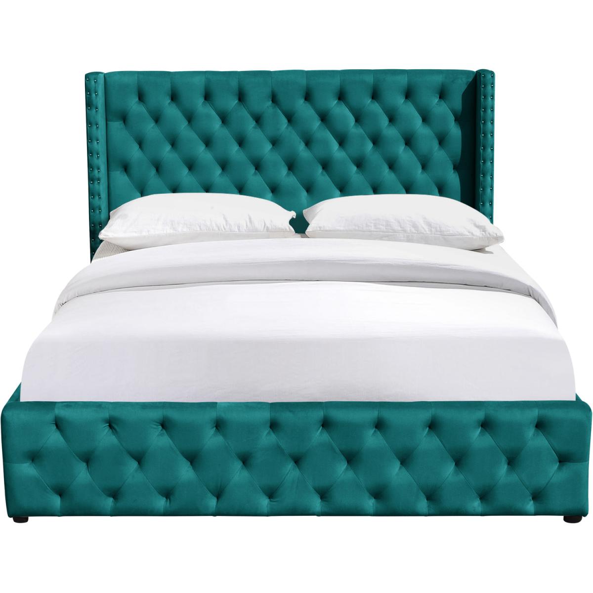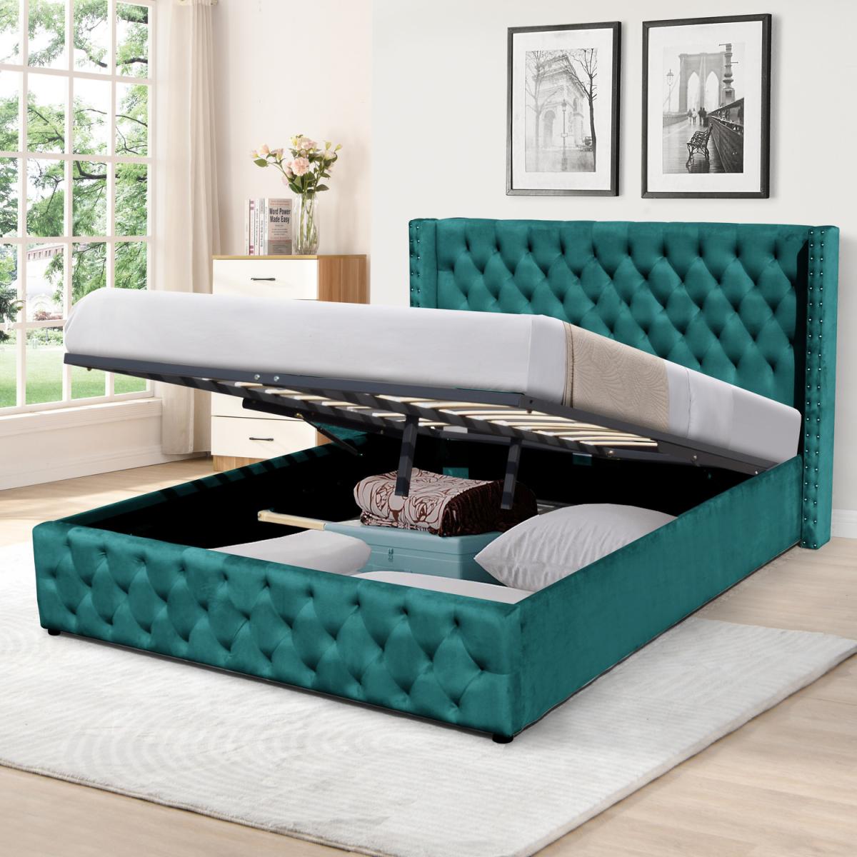 Winged Velvet Storage Bed Frame with Headboard - Green / Double