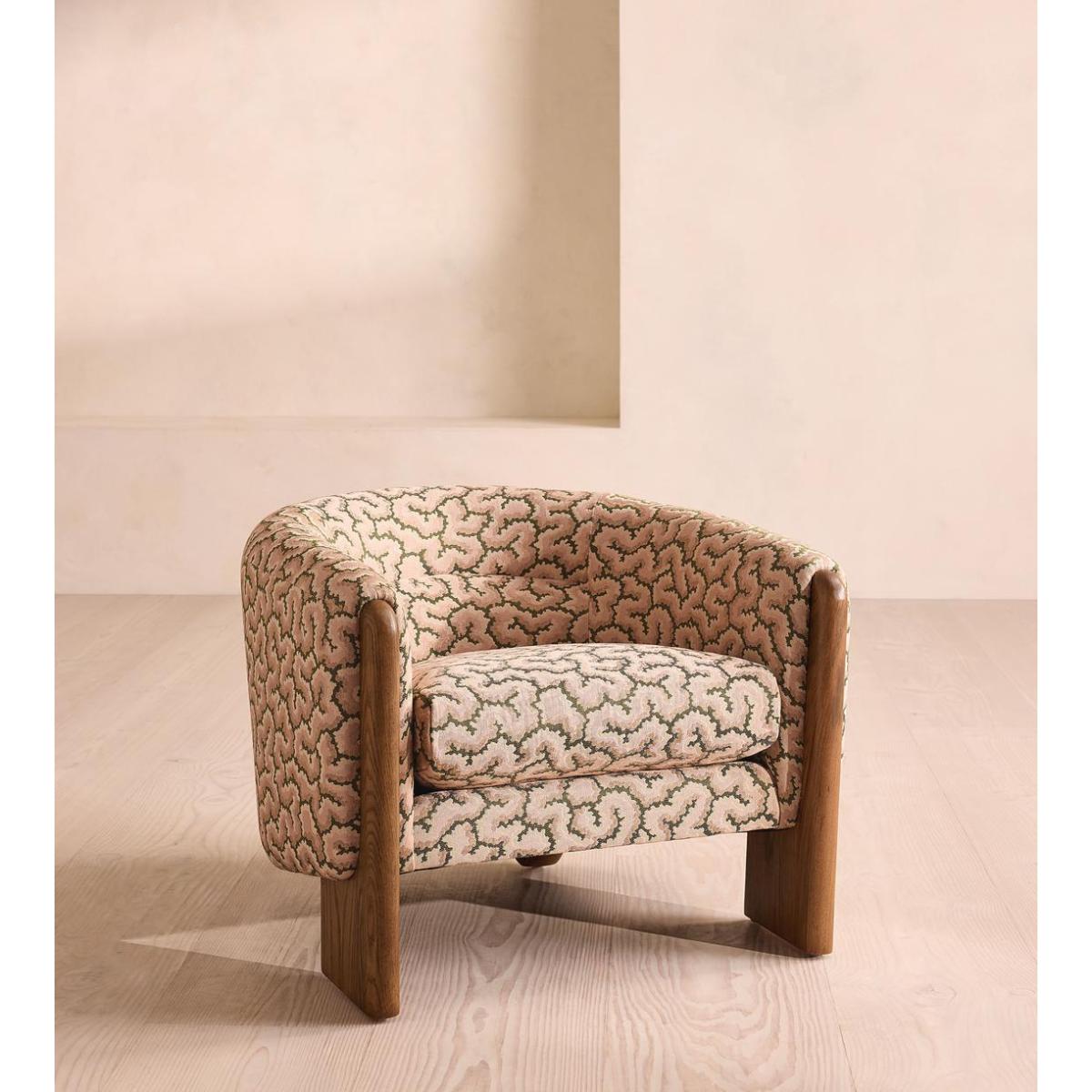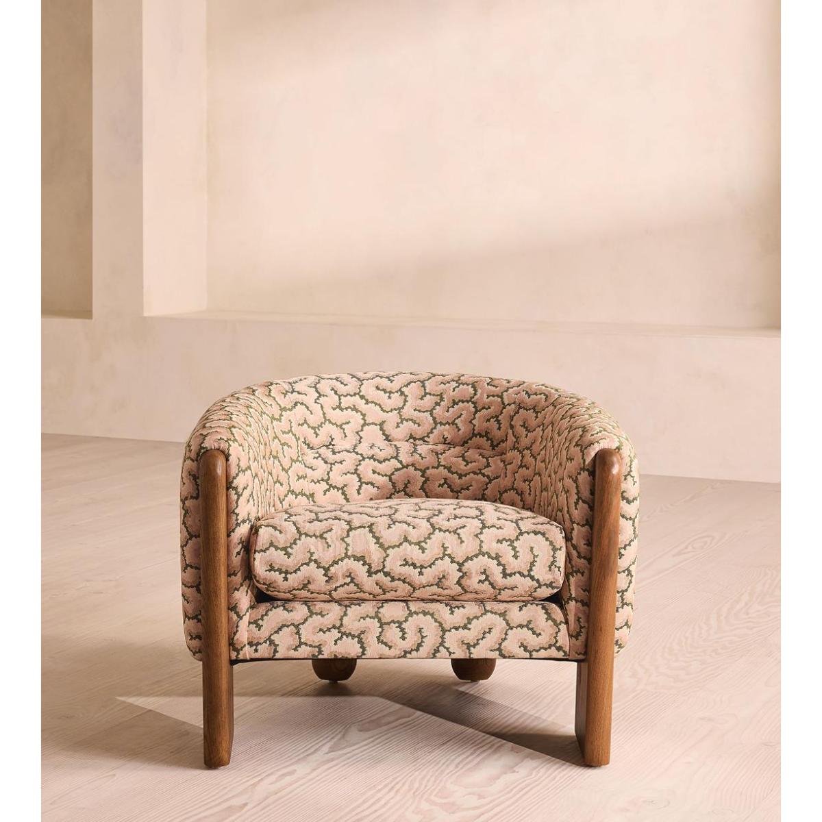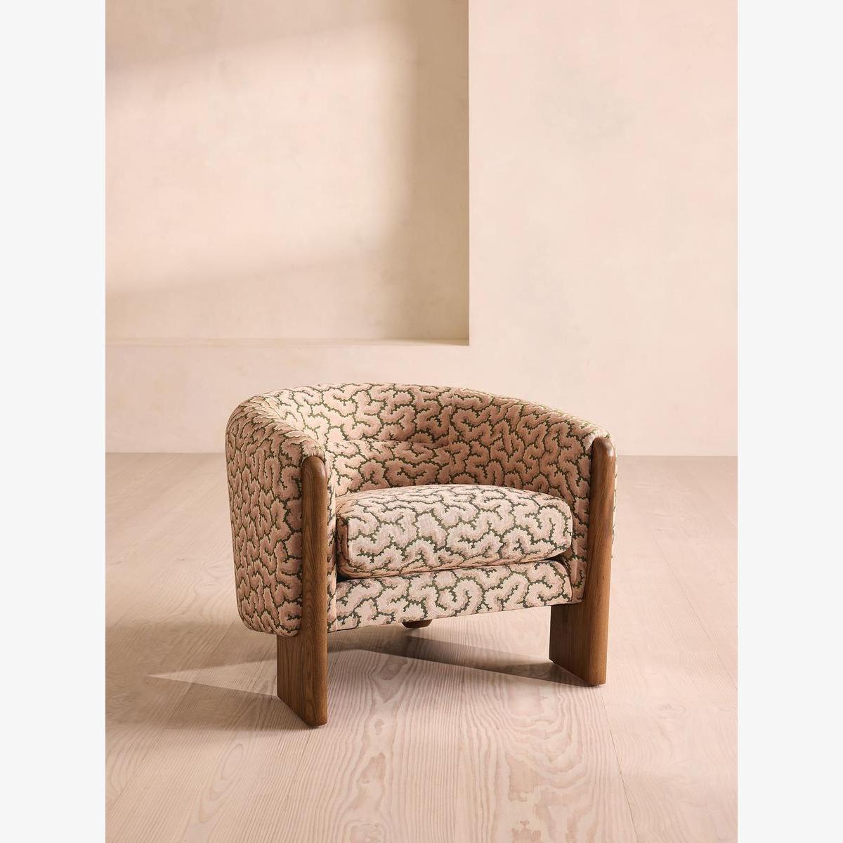 Solid oak legs support a tub-style seat upholstered in our Lophelia jacquard fabric. The hugging silhouette of our Winnie armchair is fitted with a plump, feather-wrapped seat cushion for added comfort. Exposed solid oak frontage extends to form the legs, while the back rests on rounded oak ball feet.