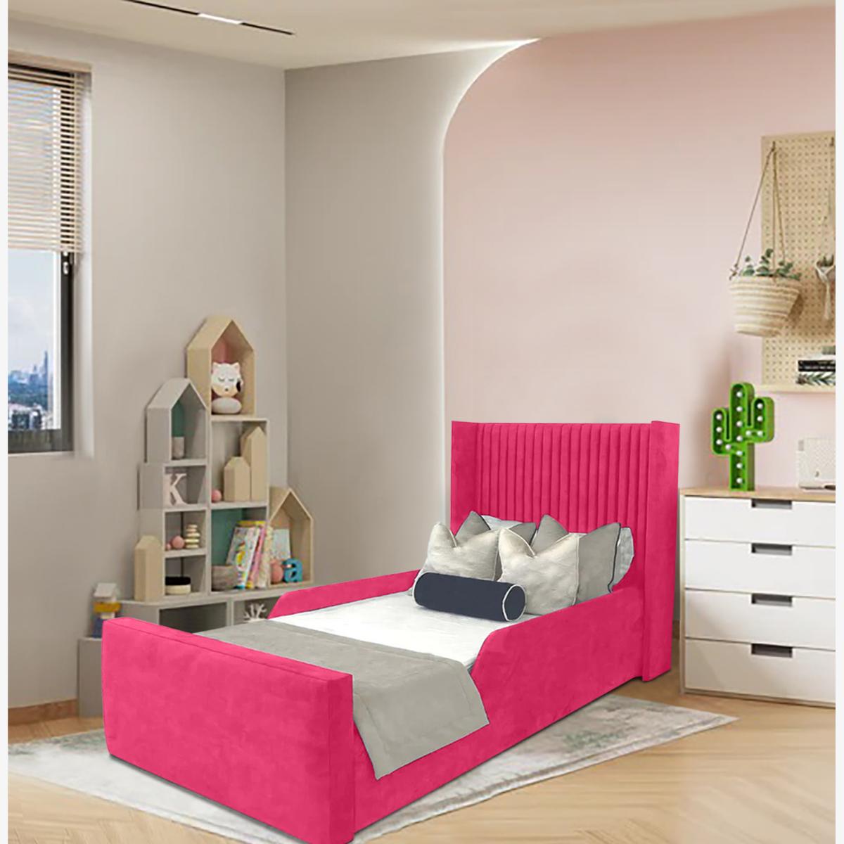 Winnie Kids Bed Gaslift Ottoman Plush Velvet with Safety Siderails - Pink / Single