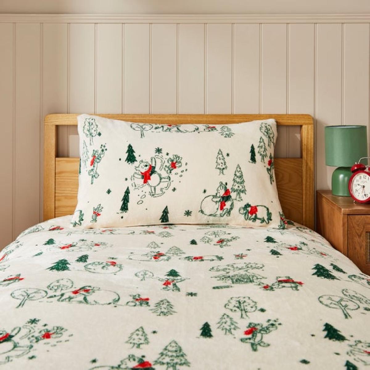 * Printed Winnie the Pooh design * Includes standard pillowcase(s) * Soft touch fleece fabric finish * Machine washable * Secure button closure * Made from 100% recycled polyester Snuggle up with a friend from the Hundred Acre Wood with our Winnie the Pooh Duvet Set. This delightful set features a printed Winnie the Pooh design and a soft touch fleece fabric finish for a cosy night's sleep. It includes standard pillowcase(s), has a secure button closure, is machine washable, and is made from 100% recycled polyester.