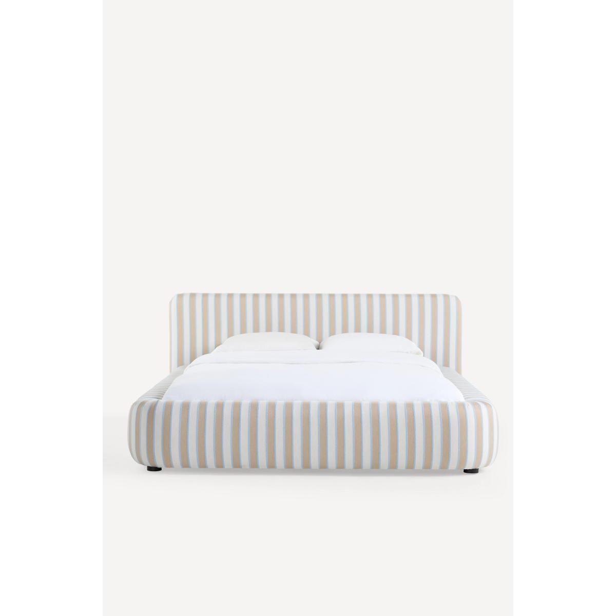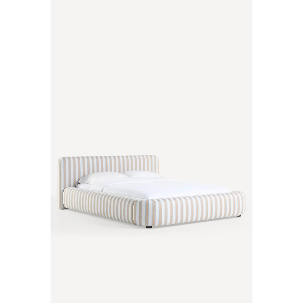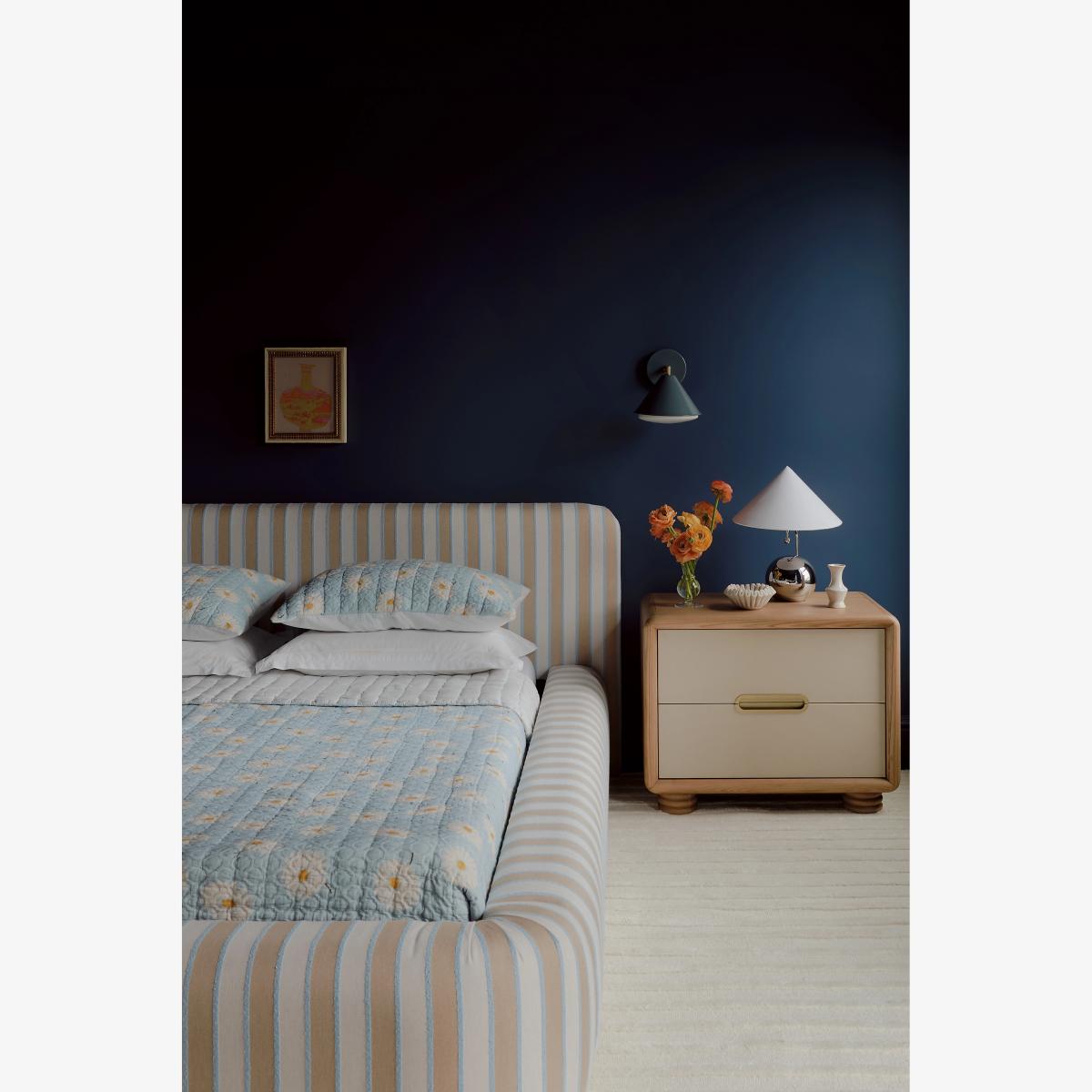 With rounded cushions that border the entirety of the frame, this silhouette beckons with feelings of warmth and coziness. * Woven upholstery: 100% polyester * Foam and fiber fill * Back of headboard not fully upholstered * Kiln-dried hardwood frame * Wooden legs are not removable * Birch wood slat support system; does not require a box spring * Professionally clean * Easily assembled upon delivery * Imported