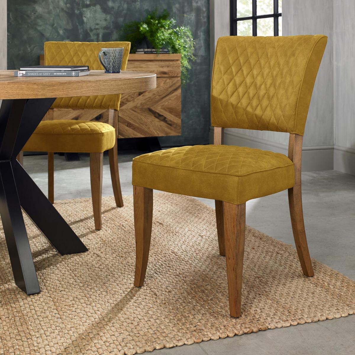 Elevate your dining space with the timeless elegance of the Winnipeg Rustic Oak Dining Chairs. Beautifully designed and generously proportioned, these chairs combine comfort with craftsmanship for an indulgent dining experience. The diamond-stitched upholstery adds a touch of sophistication, while the plush padded seats and gently flared backs ensure lasting comfort. Available Finishes: Dark Grey Fabric, Old West Vintage Bonded Leather, Azure Velluto Velvet, Cedar Velluto Velvet, Mustard Velluto Velvet, and Rust Velluto Velvet FEATURES: Stylish Design – Elegant diamond stitch detailing on seat and back Exceptional Comfort – Plush padding with gently flared backrests Premium Materials – Crafted with high-quality fabric or bonded leather upholstery Durable Construction – Tapered wooden legs in a rustic oak finish for a sturdy, timeless look Sold as a Pair – Perfectly matched for any dining room setting Delivered Fully Assembled 2 Year Manufacturers Warranty DIMENSIONS: Depth: 65cm Width: 48cm Height: 91cm Seat Height: 50cm Seat Depth: 45cm All screens vary in colour reproduction and whilst every effort has been made to display the colour as accurately as possible it is for guidance only.