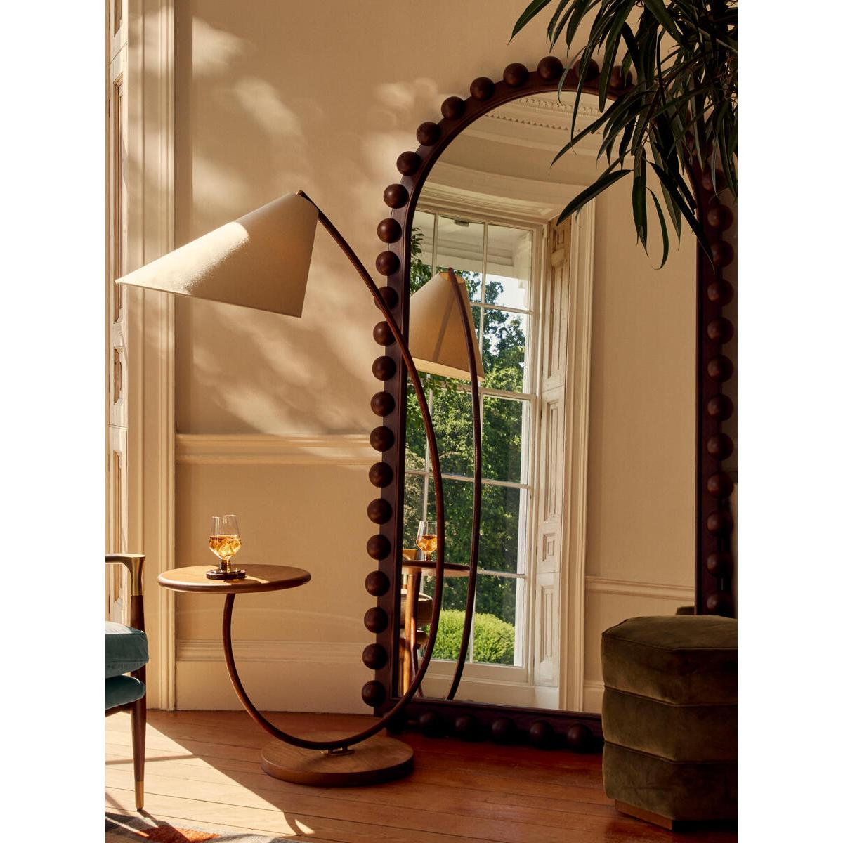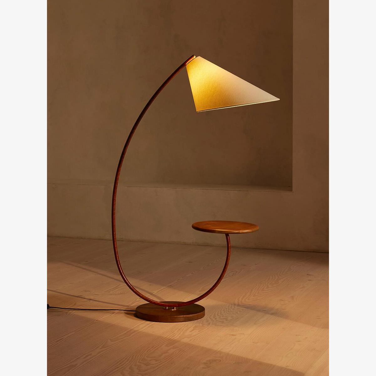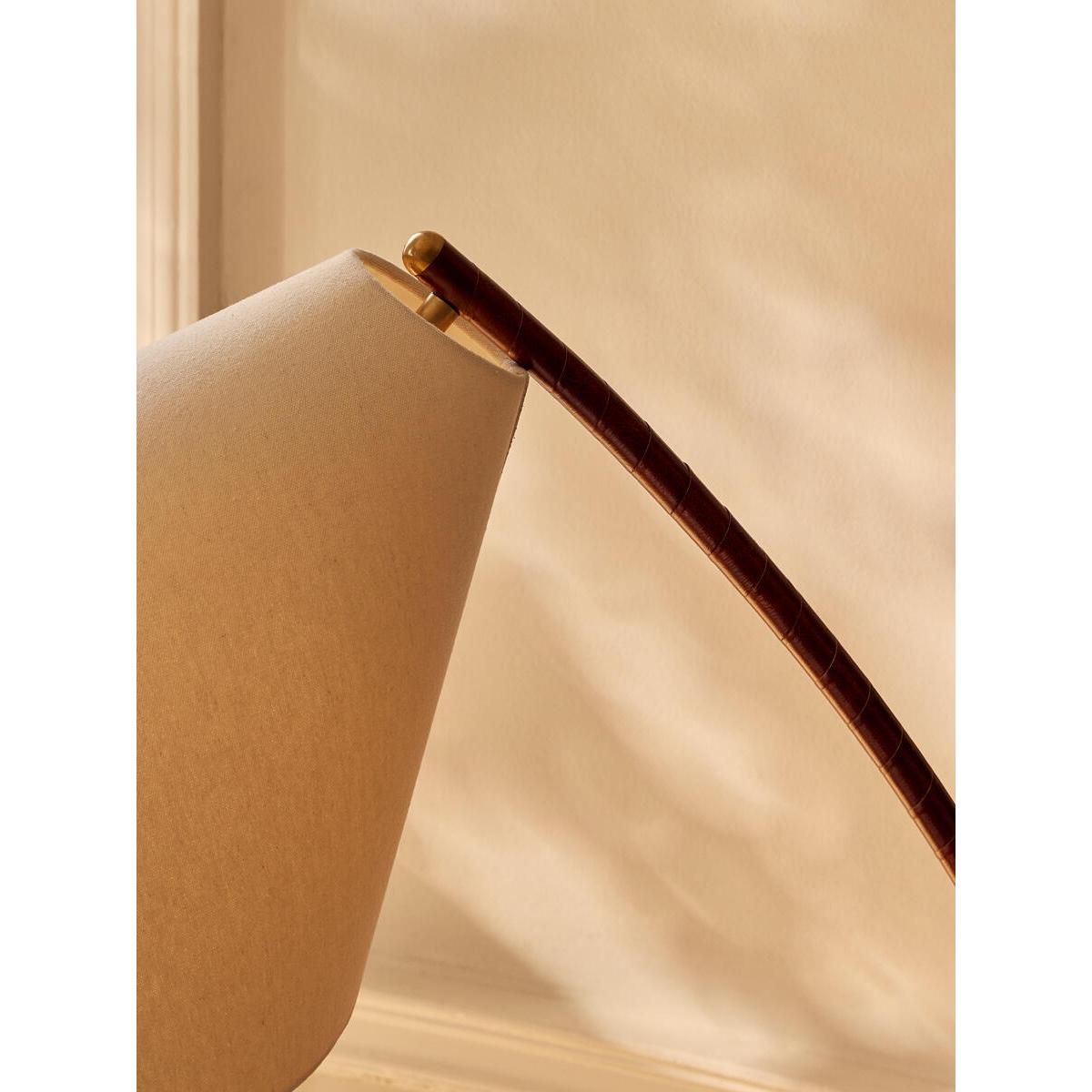 Our Winona floor lamp considers both style and function in one distinguished design. Inspired by Soho House Amsterdam, the sculptural arch shape has a leather-wrapped arm with a turned solid oak base and a co-ordinating side table top. A tapered linen shade futher elevates this unique piece to create a stand-alone statement in any corner of the home. All of our portable lamps are fitted with dimmer switches, allowing you to tailor the light level to your mood. Arch floor lamp and table in one Leather-wrapped antique brass arm Natural linen tapered shade Turned solid oak base and table top Recommended bulb:Tala 6W Globe LED Inspired by Soho House Amsterdam