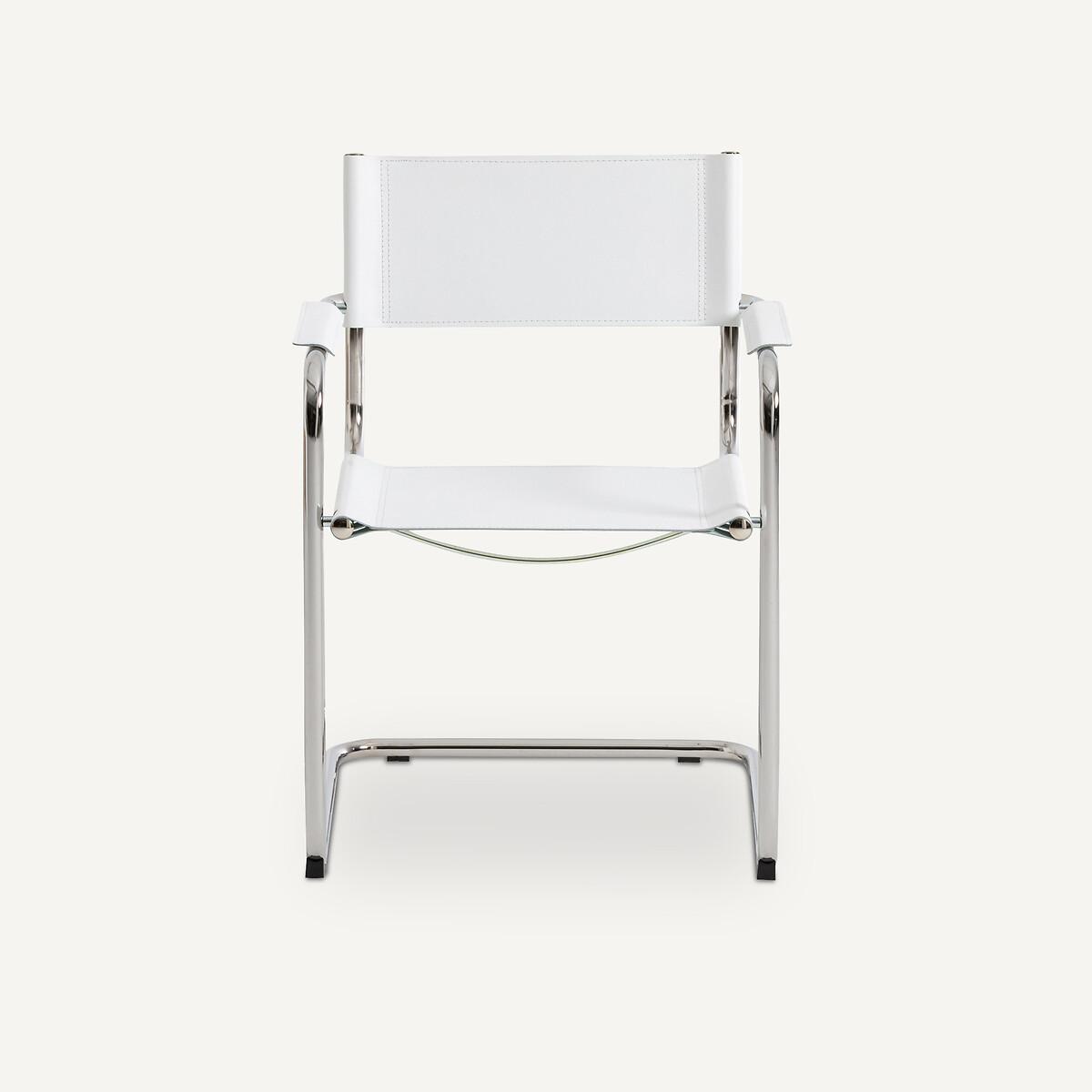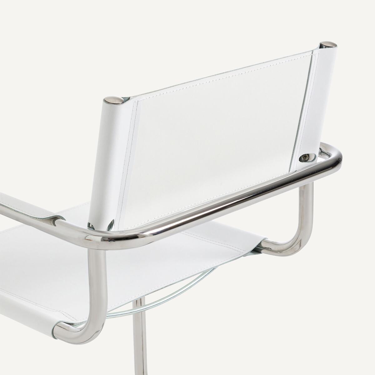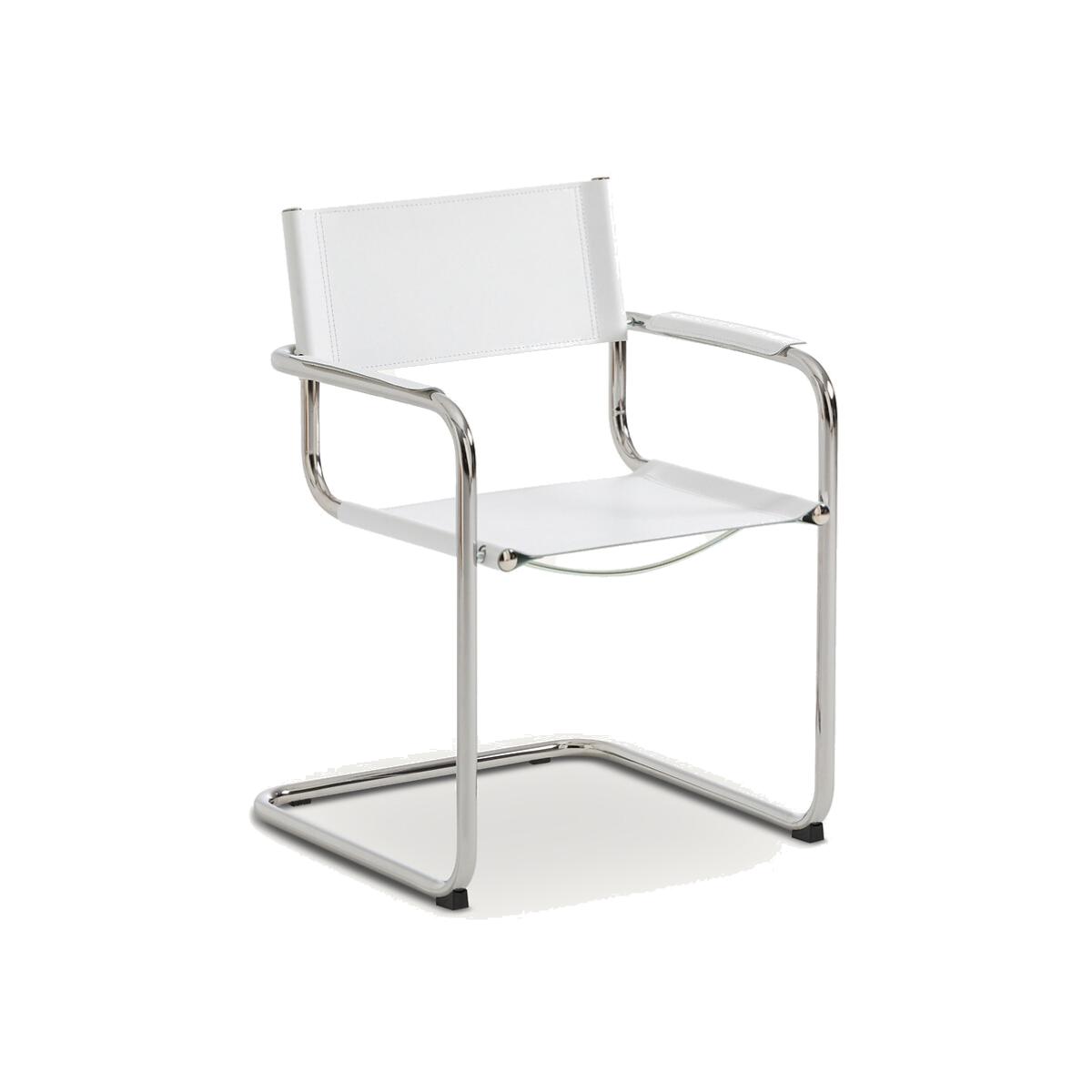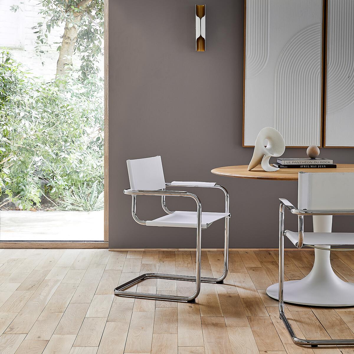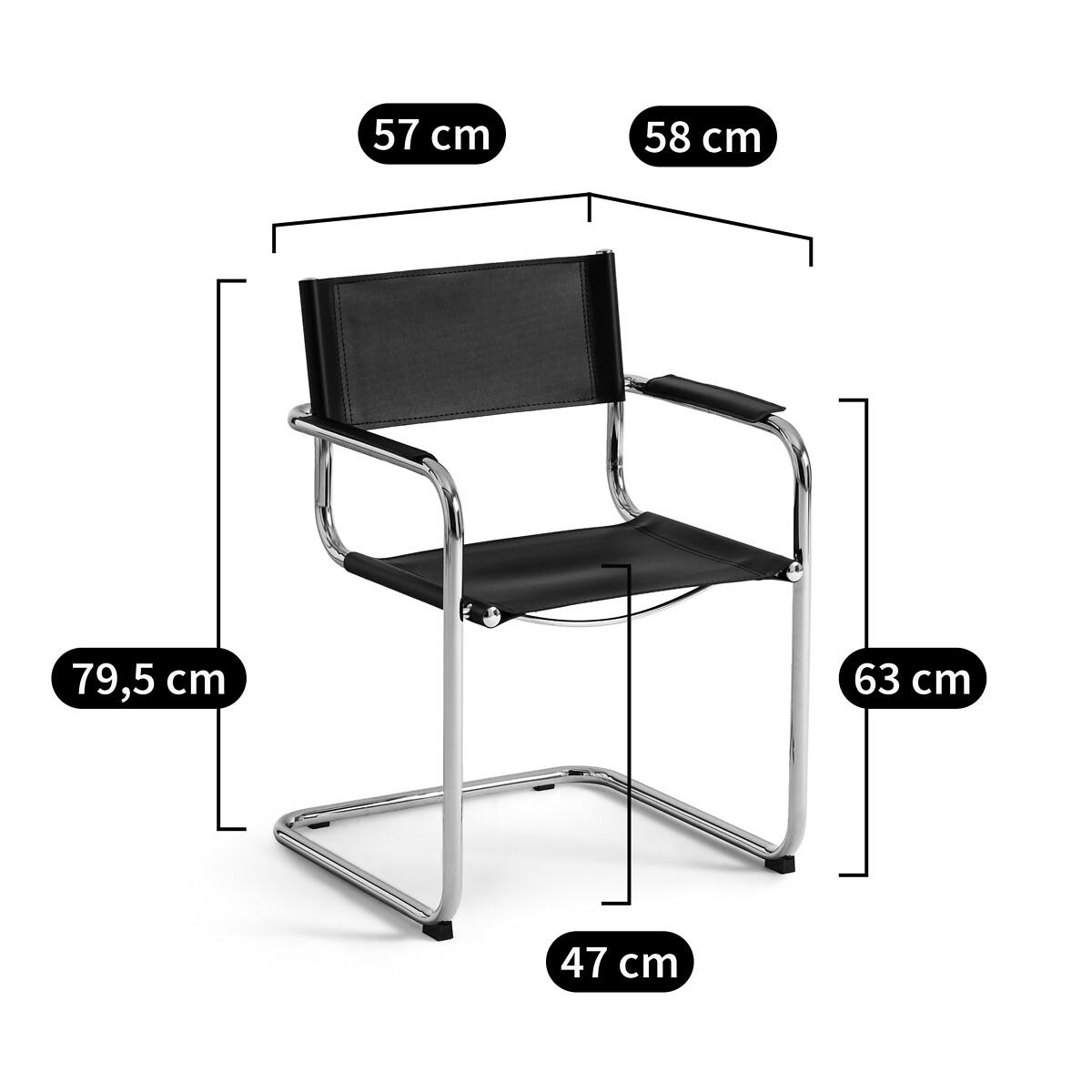 Made in Italy, the Winset table armchair reinterprets the design codes of the 1950s in a contemporary way. The backrest, seat and armrests are made of genuine split leather. The tubular structure is in chromed steel. A table chair as aesthetic as it is comfortable. Product Details • Seat, backrest and armrests in genuine split leather (Bovine, corrected grain, chrome tanning, pigmented finish) • Tubular structure in chromed steel. Dimensions • Length: 57cm • Height: 79.5cm • Depth: 58cm • Seat height: 47cm • Armrest height: 63cmDelivery:. Sold pre-assembled. Available for home delivery. • Made in Europe. Dimensions and weight of parcel1 parcel L62 x H80 x D60cm. 9kg.