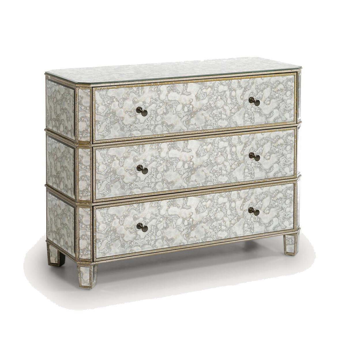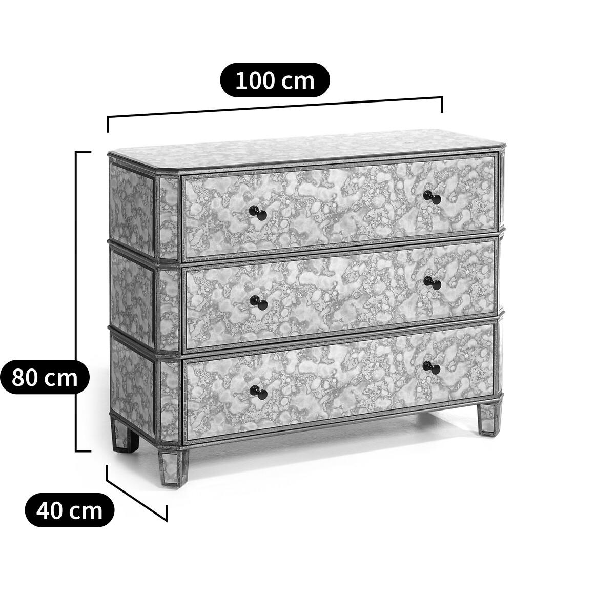 The Winsome dresser. This dresser is entirely covered with mirrors, which have been oxidised for an aged effect. Product Details • MDF structure covered with oxidised mirrors for a distressed effect • 3 drawers. Dimensions • Total: L100 x H80 x D40cm • Useable drawer dimensions :L86.5 x H15.7 x D33cm. Home Delivery. Your chest of drawers will be delivered to your door by arrangement ! Note! Please check that all access points are large enough to accommodate your delivery (doors, stairs, lifts). • WOOD FROM SUSTAINABLY MANAGED FORESTS. FSC® certified wood comes from forests that are environmentally, socially and economically well managed. Parcel Dimensions • L112 x H90.5 x D52.5cm • 56kg