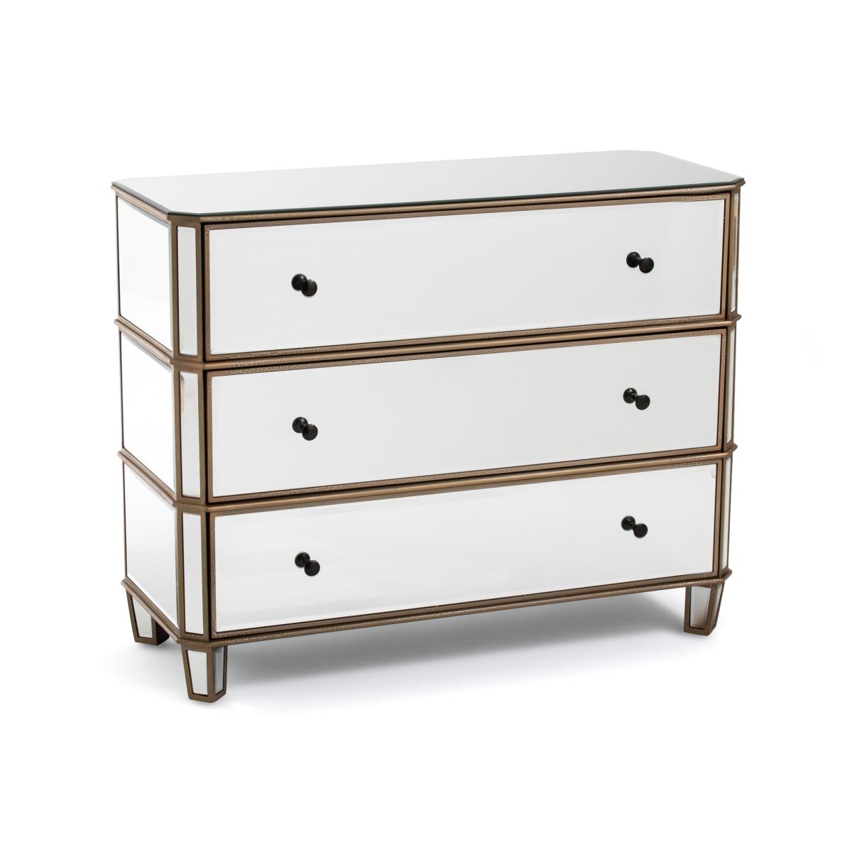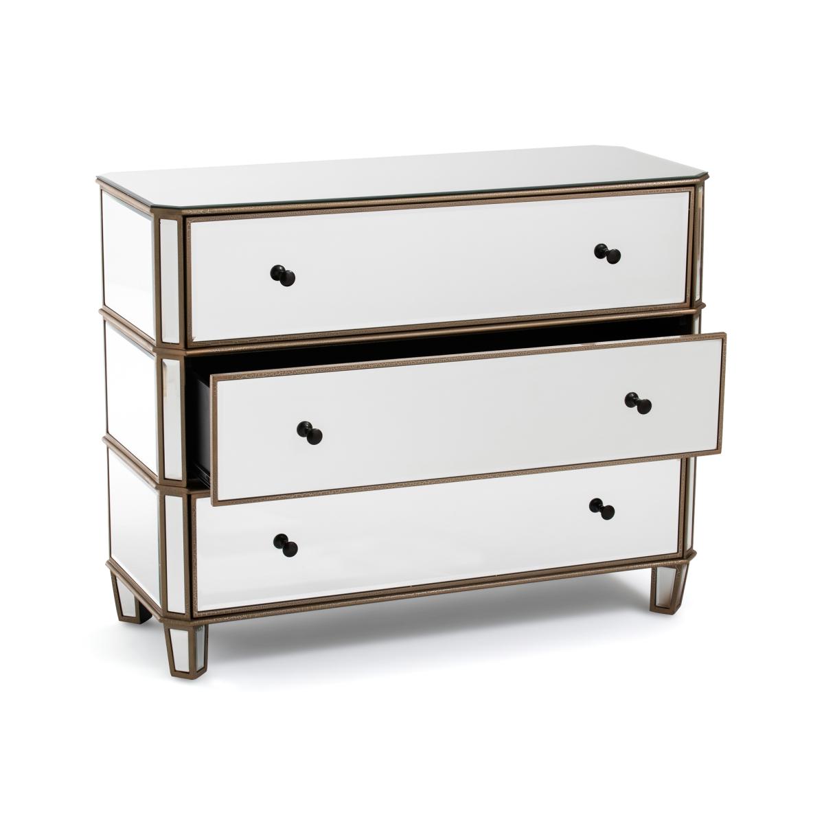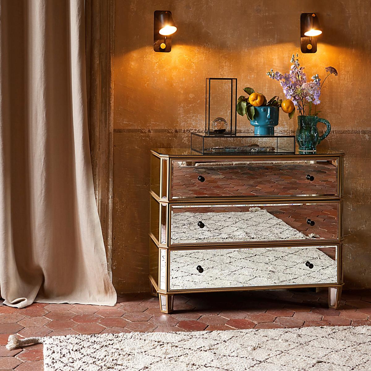 The Winsome dresser. A beautiful glossy finish for this chest of drawers, completely covered with mirror glass. Product Details • MDF structure covered with mirrors • 3 drawers • Supplied pre-assembled. Dimensions • L100 x H80 x D40cm • Useful drawer space:L86.5 x H15.7 x D33cm • Weight: 55.5kg Parcel dimensions and weight • L112 x H90.5 x D52.5cm • 56kg