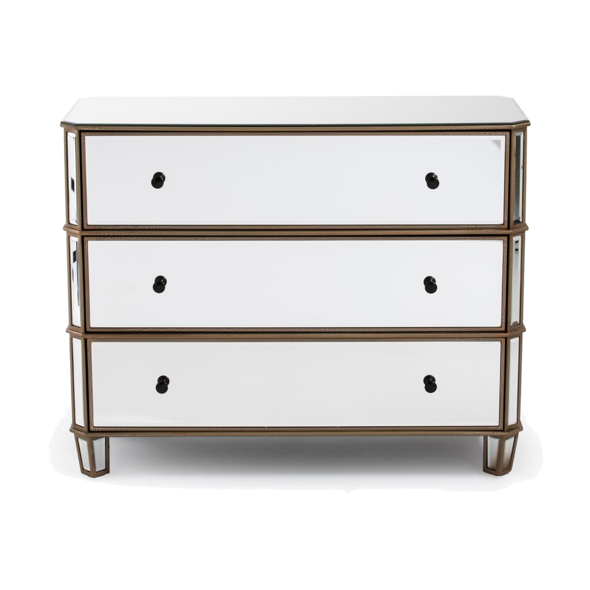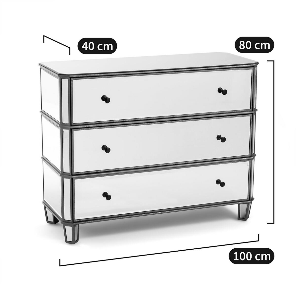 I love this chest of drawers because of its sleek, mirrored detailing combined with the contemporary frame, making it a versatile piece that can elevate various interiors. It's especially well-suited for modern or glam-inspired spaces, where its reflective surfaces can help bounce light and make the room feel more spacious. Practical styling tips include pairing it with minimalist hardware to maintain a streamlined look, or accessorising with a few well-chosen decorative items like glass vases or metallic accents to enhance its reflective qualities. In bedrooms, it’s perfect for adding a touch of glamour while providing ample storage, and it can also work well in hallway or living areas as a statement piece.