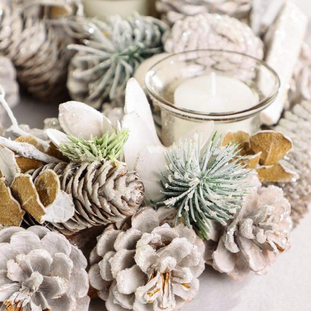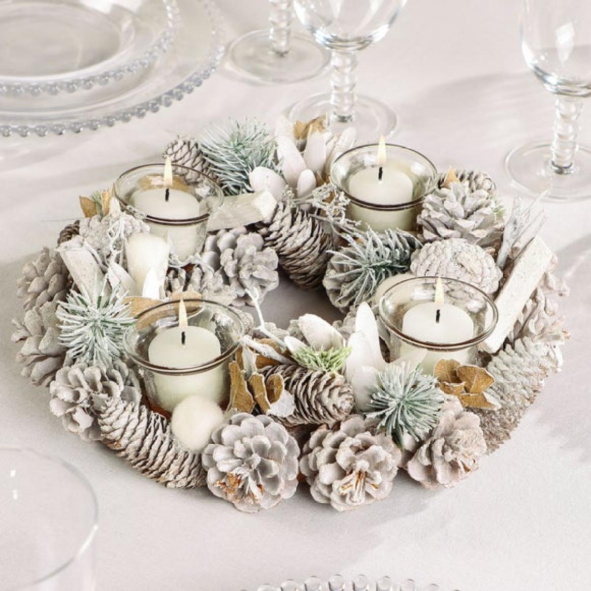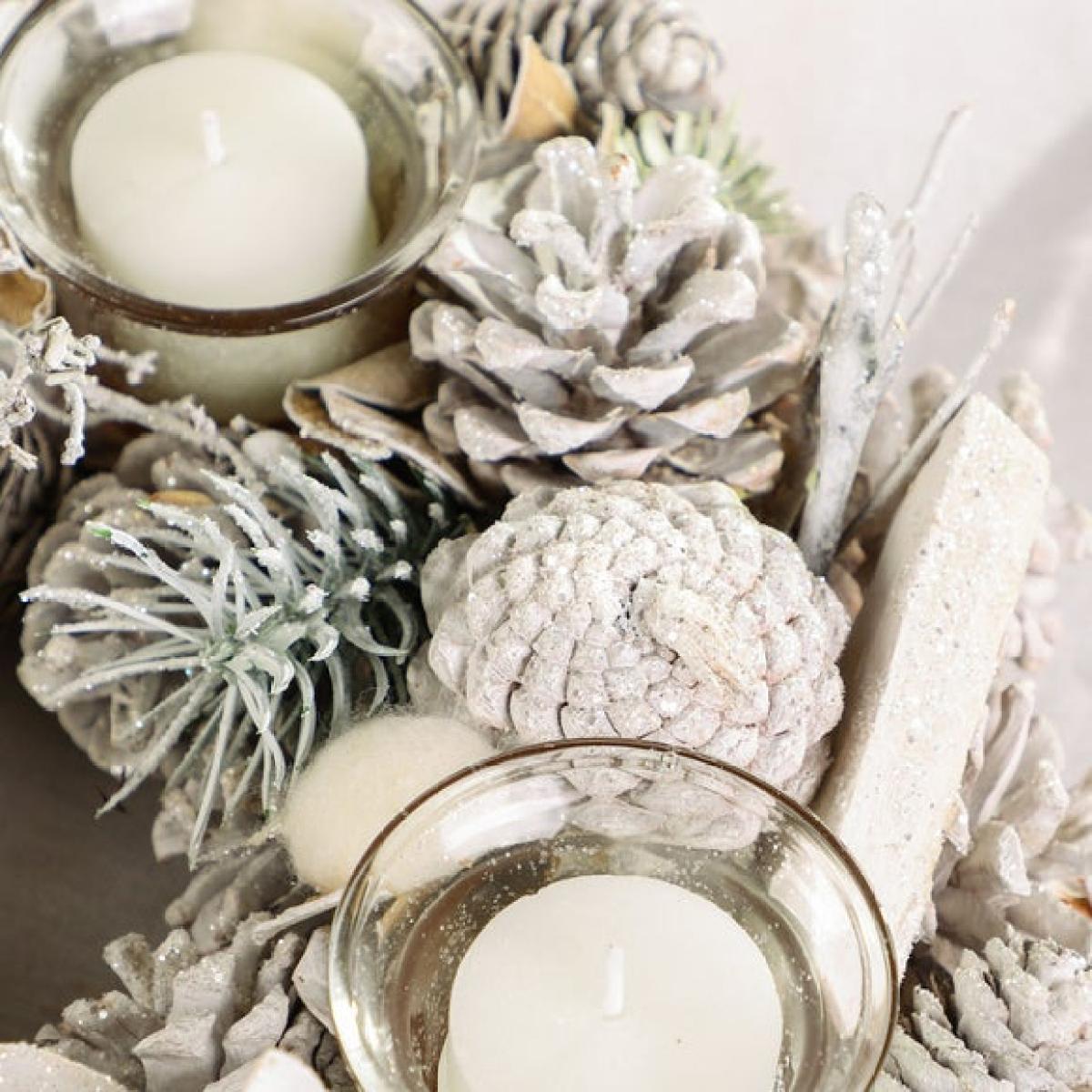 * Frosted look * Real woodland foliage * 4 glass candle holders * Pinecone & snowdrop flowers * Suitable for votive sized candles or tealights (not included) No coats or boots are required for that wintery walk feeling this season with this frosted candle holder wreath. Bring the sense of a crisp forest to your table with this wreath of snow-covered foliage, pinecones and snowdrop flowers nestling in between glass candle holders. Suitable for your favourite votive candles or tealights, the flames will illuminate the wreath making it sparkle – a perfect table centrepiece or additional decor for your home.