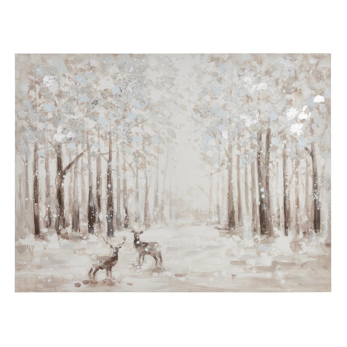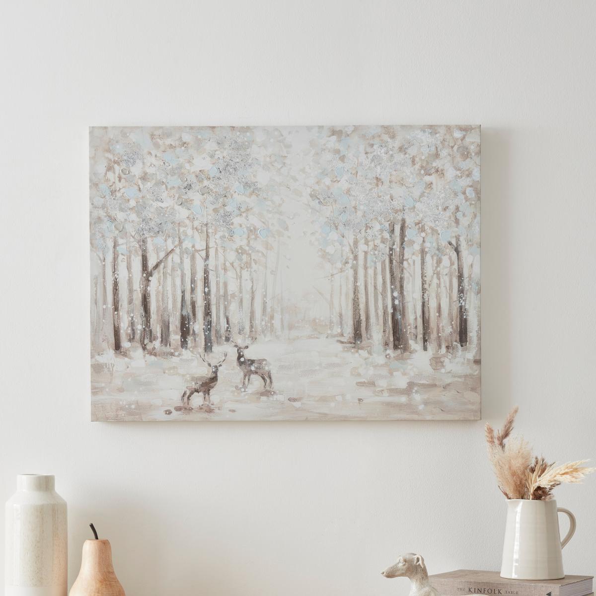 With its stunning painterly style, the Winter Stag Canvas would make an exquisite addition to any home. Complete with a stunning silver textured finish to enhance the winter forest fawn scene, the perfect finishing touch to any bedroom, living space or hallway.