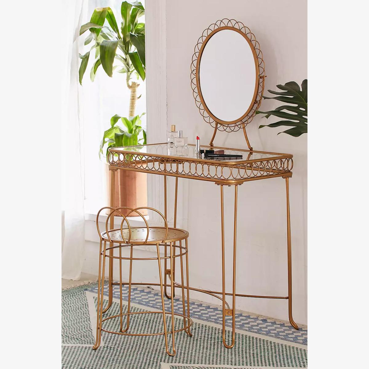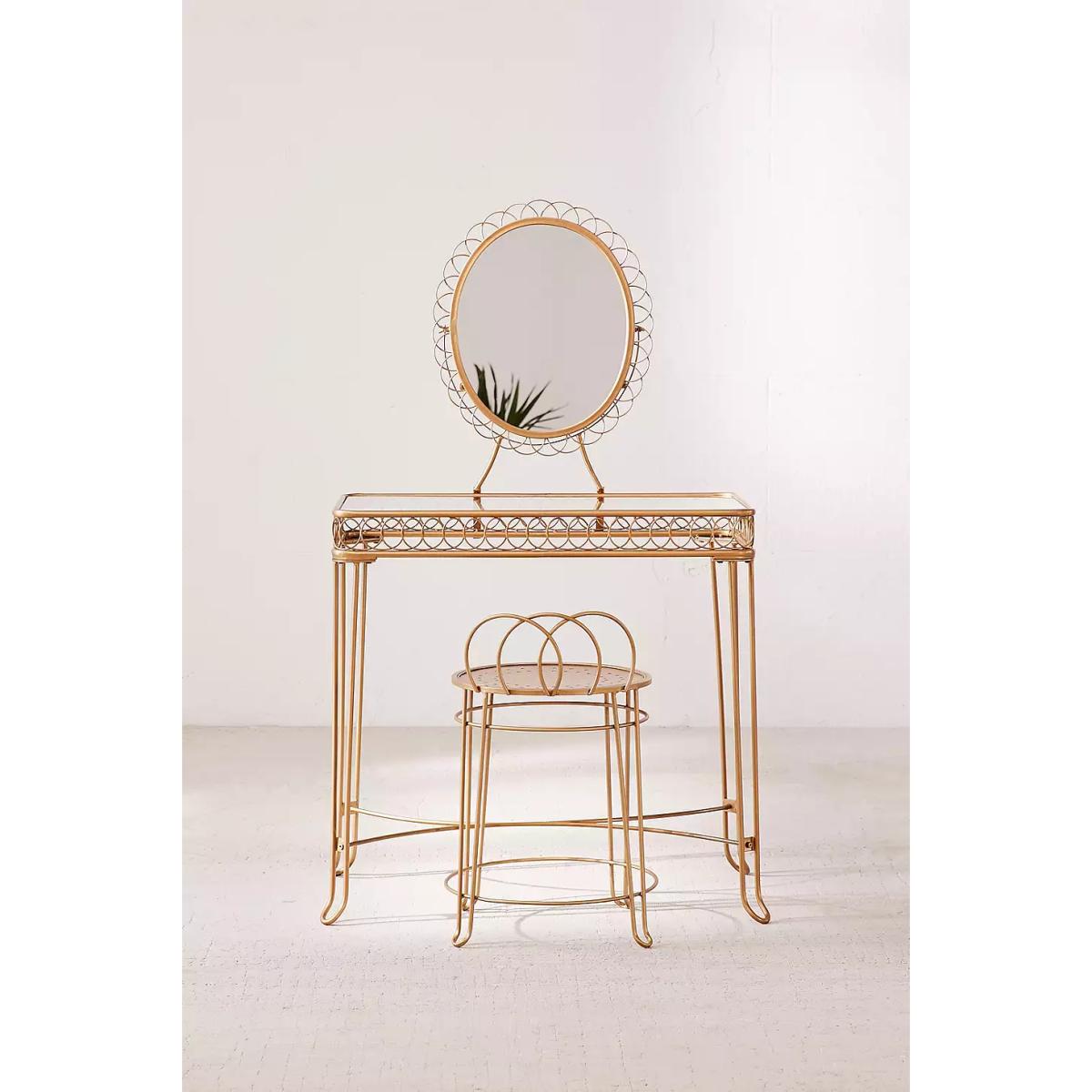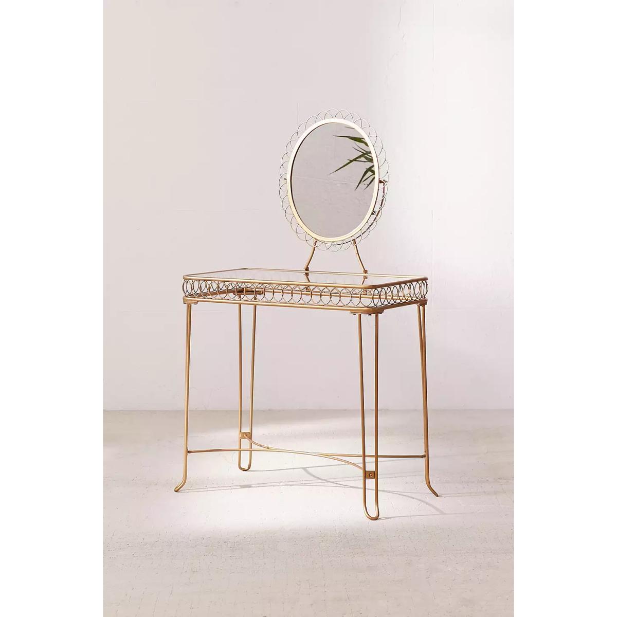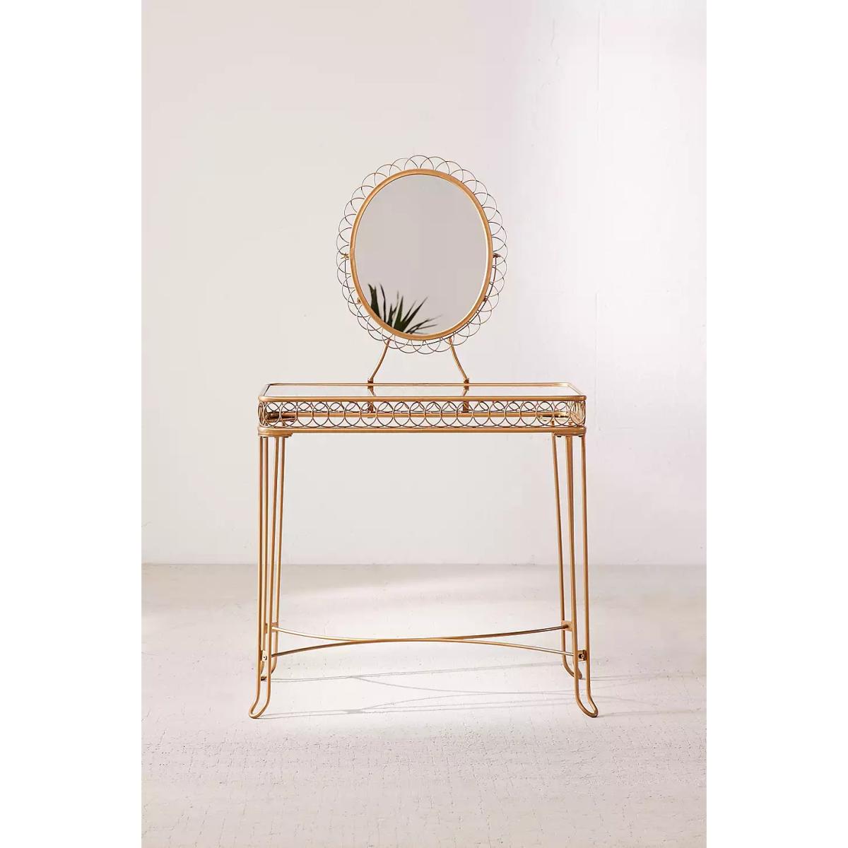 Complete your space with this minimal gold dressing table. Wire complete with a glass top and oval mirror. Finished with wired legs at the base. *Online return only. This item cannot be returned instore. Please note furniture items currently cannot be shipped to Northern Ireland or The Republic of Ireland. Delivery of large furniture items may take 1-2 weeks and are therefore not eligible for Next Day Delivery.* **Content + Care** \- Iron \- Wipe clean **Size** \- Width: 81.2cm \- Depth: 43cm \- Height: 129.5 cm \- Weight: 58.97 lbs \- Shipping package dimensions: 78.7l x 21.08w x 48.3 cm \- Shipping package weight: 27.33 lbs
