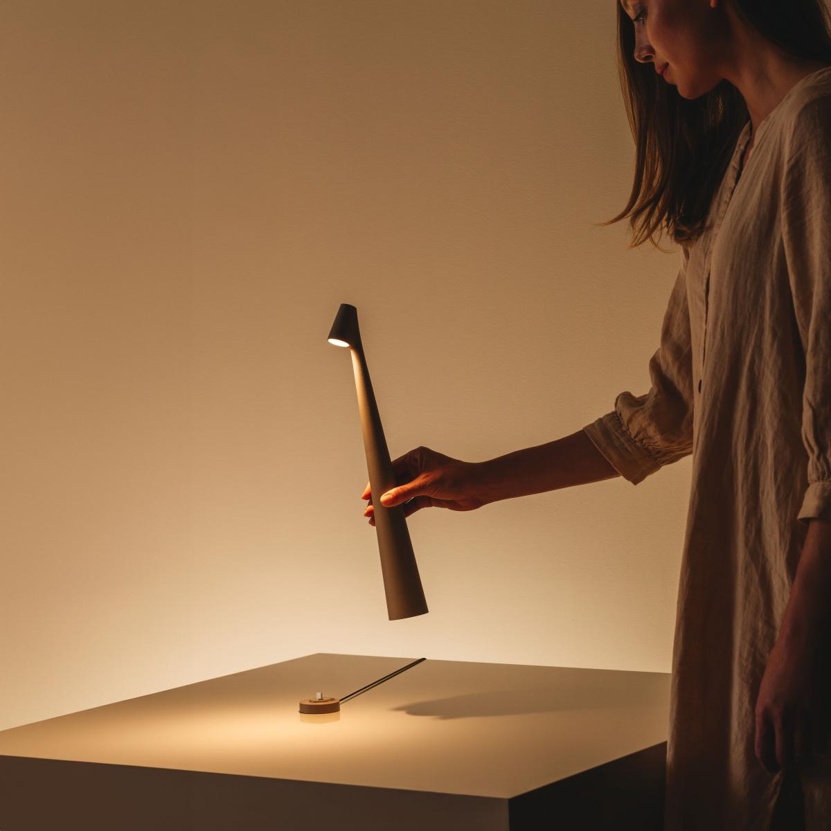 Made from a single piece of Aluminium, the Africa Lamp is a sculptural reinterpretation of the traditional work lamp. Designed by Francisco Gómez Paz, it combines formal richness with outstanding lighting performance. With its slender conical Base, legs and elegant head, the Lamp invites you to reach out and grasp it. Gómez Paz's first intuition was to break away from the mechanical aspect of the work lamp and give it a certain freedom, thanks to a battery-powered LED light source that provides a very special kind of close-up, focused illumination. Being able to take this focal point with you is very powerful, creating a work surface wherever you are, whether it's a dining table or a reading nook.