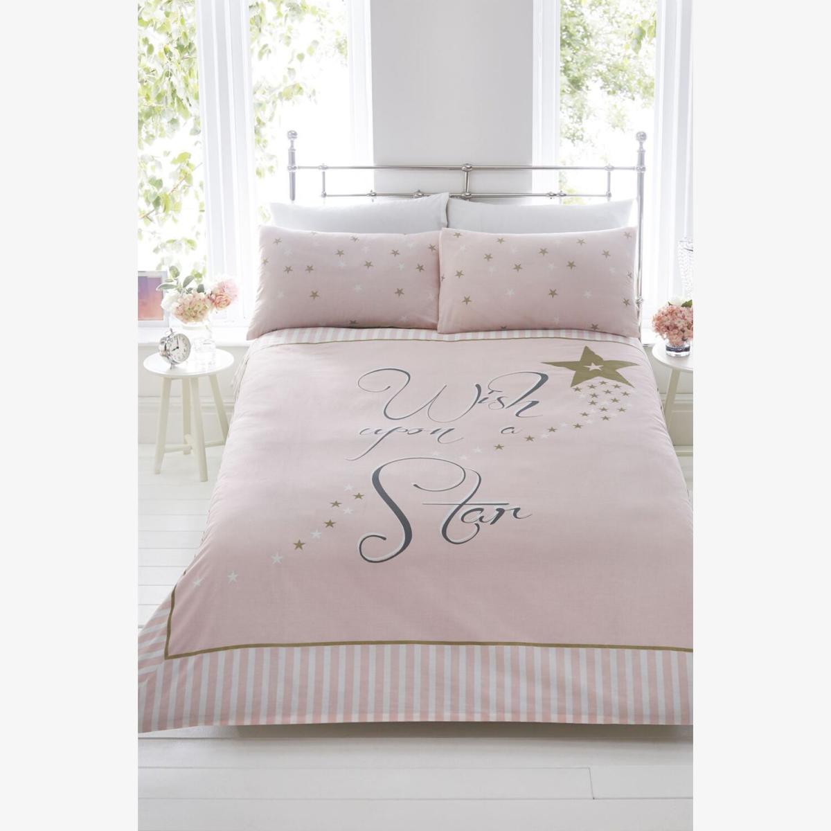 Wish upon a star duvet cover bed set, features 'Wish upon a star' printed over a soft pink background, peppered with magical stars. This bedding is perfect for adding a subtle festive touch to your bedroom.