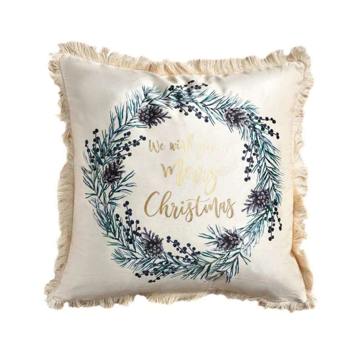 Wish You A Merry Christmas Cushion With Foil Design and Fringe Trim, Cream