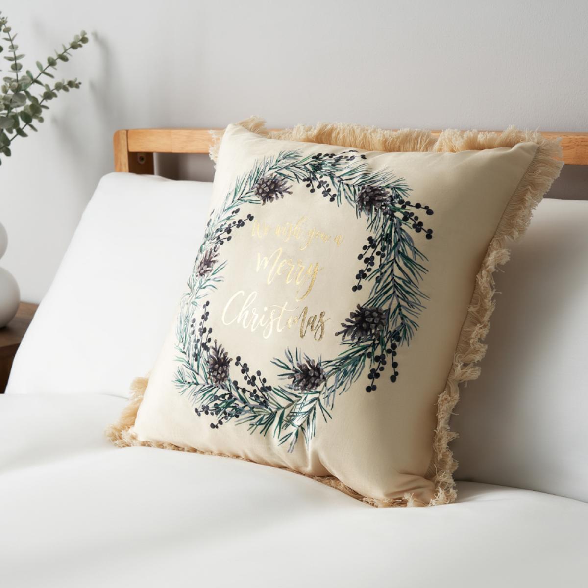 Our Wish You A Merry Christmas Cushion with Foil Design and Fringe Trim in Cream is a gorgeous way of adding a traditional accent to your home this festive season. The fringed edge of this foil patterned cushion combines a classic look with a playful texture. The wreath design of this Christmas pillow stands out thanks to the neutral cream background, wonderfully combining contemporary looks with a classic message and design.