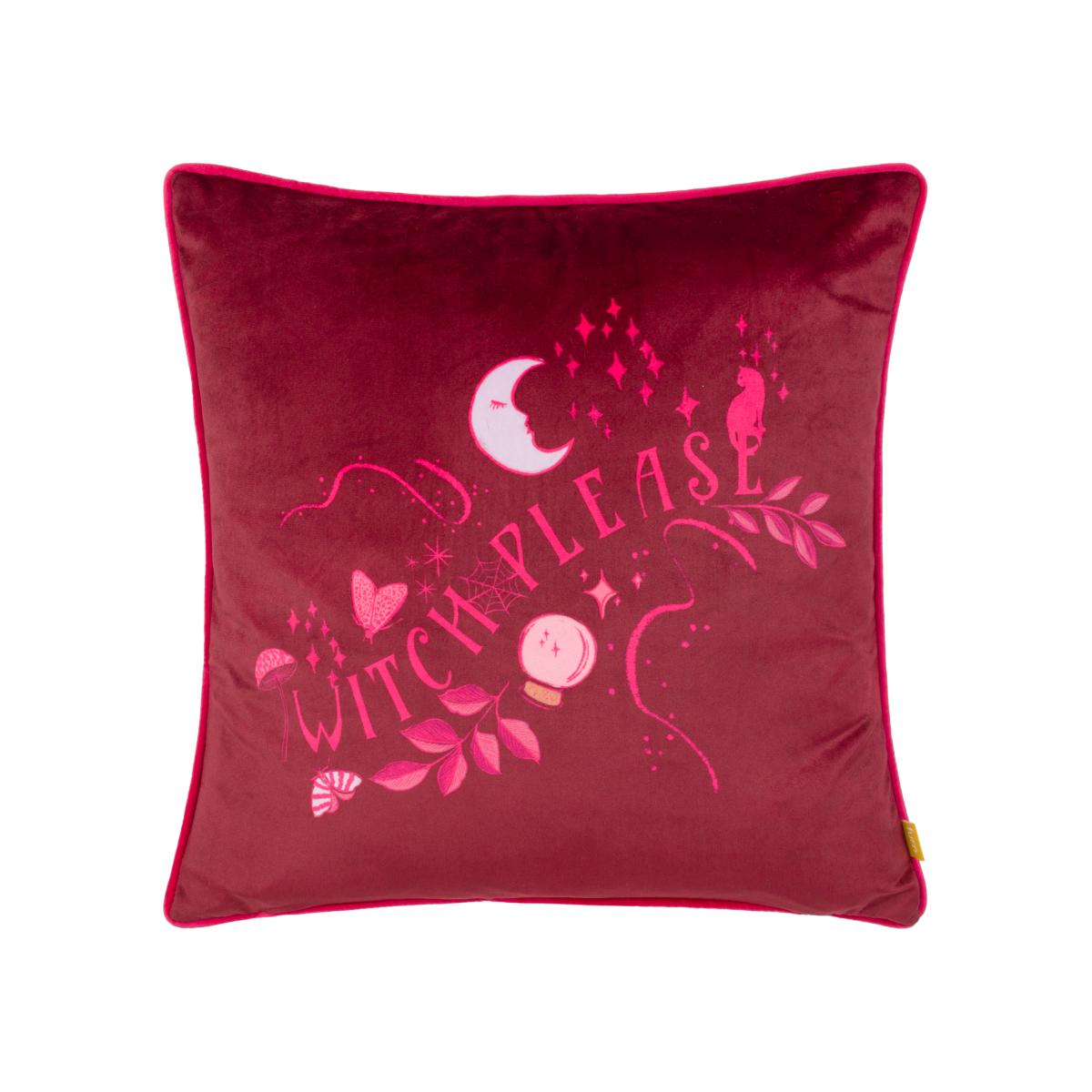 Whether its Halloween or the witching hour, the mystical world is ready to help you relax with the Witch Please cushion! Mysterious symbols, conjuring potions and magical icons are printed on a berry coloured opulent velvet. Turn it over and abracadabra, a whole host of spells, icons and mystical expressions appear, printed on a bright pink velvet background, giving you two spellbinding designs to choose from.