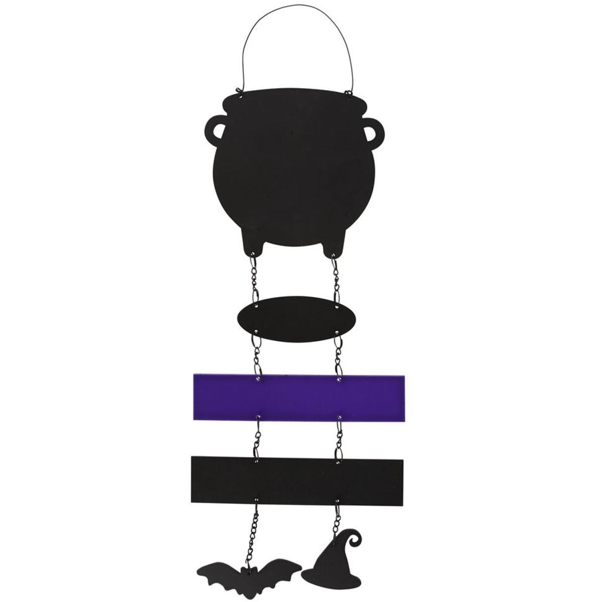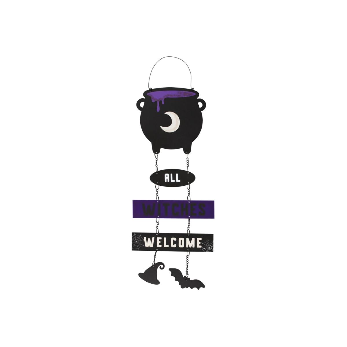 Make your guests feel welcome with this cauldron hanging chain sign, add some magic to your Halloween decor featuring a witch's cauldron brewing purple potions. Banner text reads 'All Witches Welcome' above a witch hat and bat hanging below.