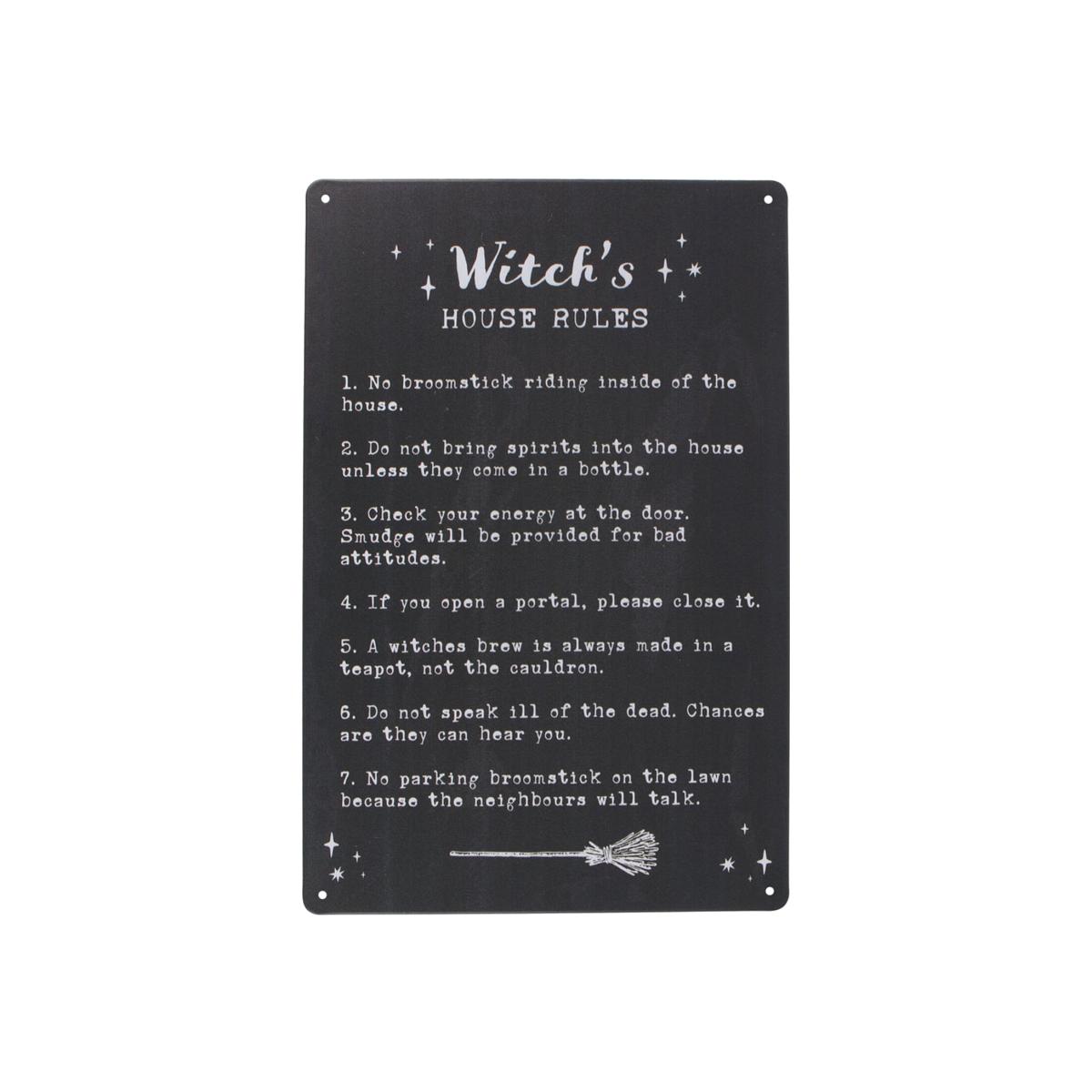 Decorative metal Witch's House Rules sign which is a must-have accessory for any magical household. Black with white text and broomstick image. 4 holes for wall fixing. No fixtures included.
