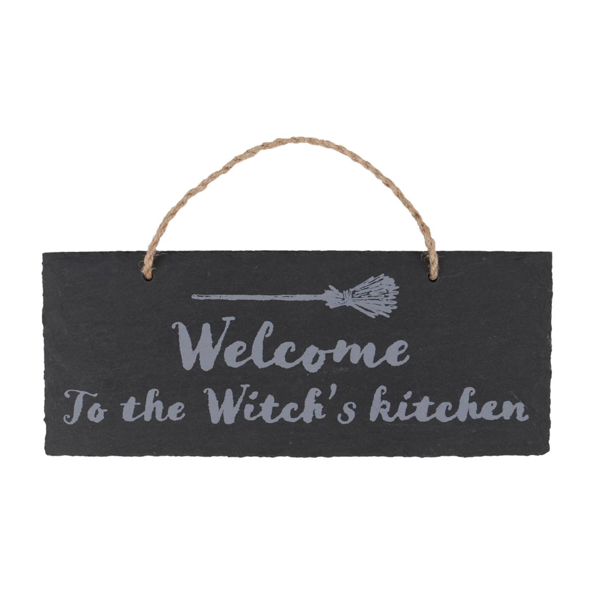 Complete your kitchen decor with this rustic slate hanging sign featuring the phrase 'Welcome to the Witch's Kitchen' and a broomstick design. Enjoy a unique and decorative finishing touch that adds personality to the room.