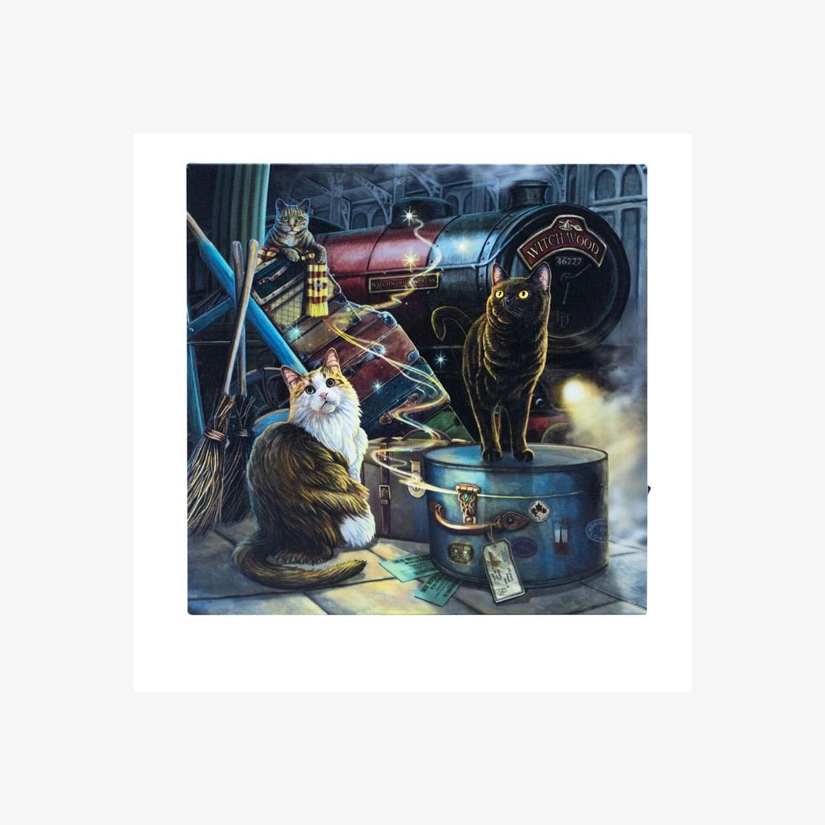 Measuring 30x30cm, this square canvas features a high-quality color print of the 'Witchwood Express' artwork by popular fantasy artist Lisa Parker. The scene unfolds with three mischievous cats playing on a train platform amidst magical luggage, creating an aura of enchantment. Dominating the background is the large, majestic 'Witchwood Express' steam train, poised to embark on its mystical journey to a world of witches and wizards. The artwork is brought to life with light-up details that add an extra layer of magic. It requires 2 x AA batteries (not included) for operation. Please note that the switch, located on the side of the canvas, may be slightly obscured by the packaging upon delivery.