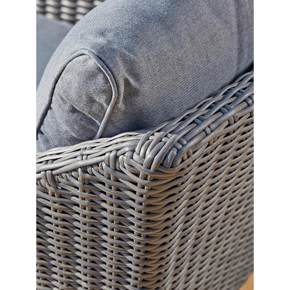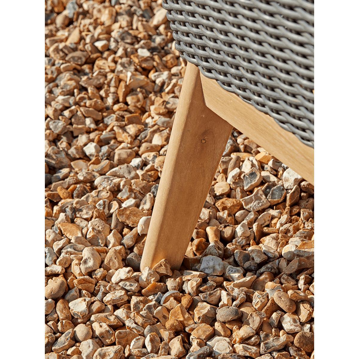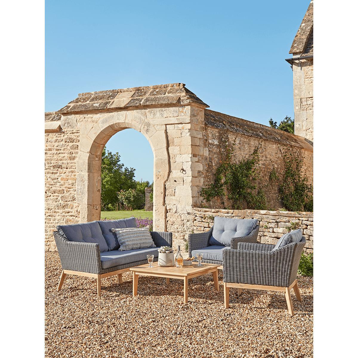 Made from weatherproof faux wicker and pale acacia wood, our attractive outdoor lounge set is the ultimate lounging solution for whiling away the hours outdoors. Each set includes a coffee table and a sofa and two chairs - with both a cosy seat and back rest cushion to each seat, in a stylish soft grey.